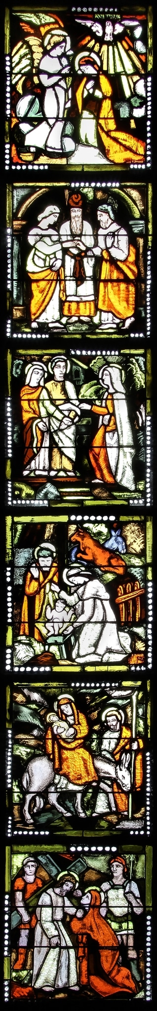 Cette verrière est composée de six scènes superposées relatant différents épisodes de la vie de la Vierge. De haut en bas : l’Annonciation, le Mariage de la Vierge, la Visitation, la Nativité, la Fuite en Égypte et la Rencontre du Christ avec sa mère durant le chemin de croix.