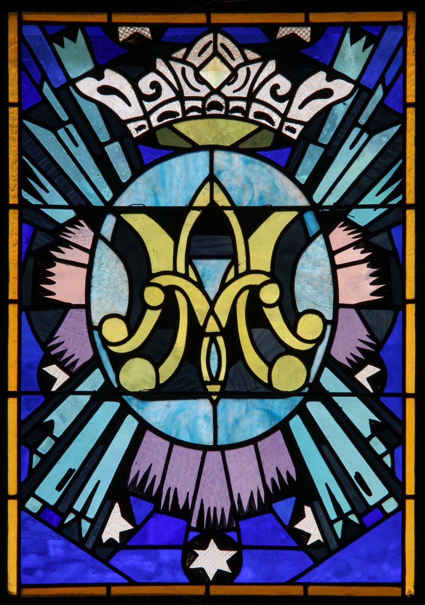 Vitrail décoratif avec monogramme marial couronné