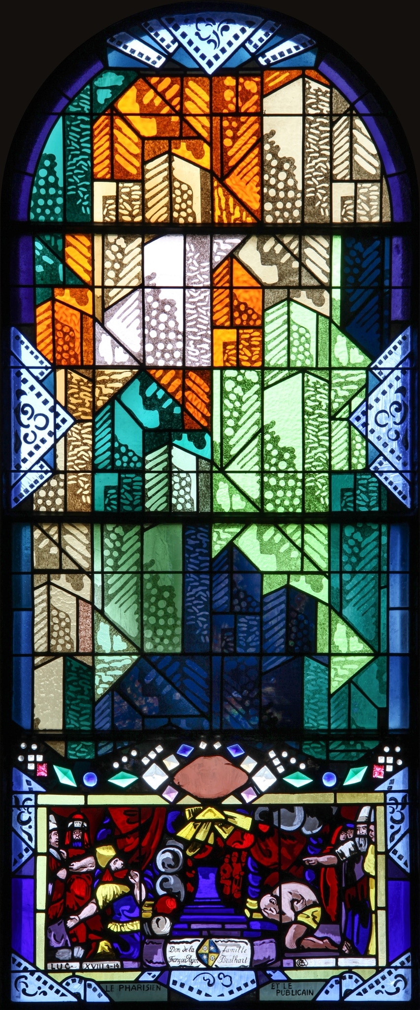 Une guirlande multicolore de cabochons et verres structurés sépare les deux secteurs, avec au centre une tête d’ange ailé inscrite dans un losange.