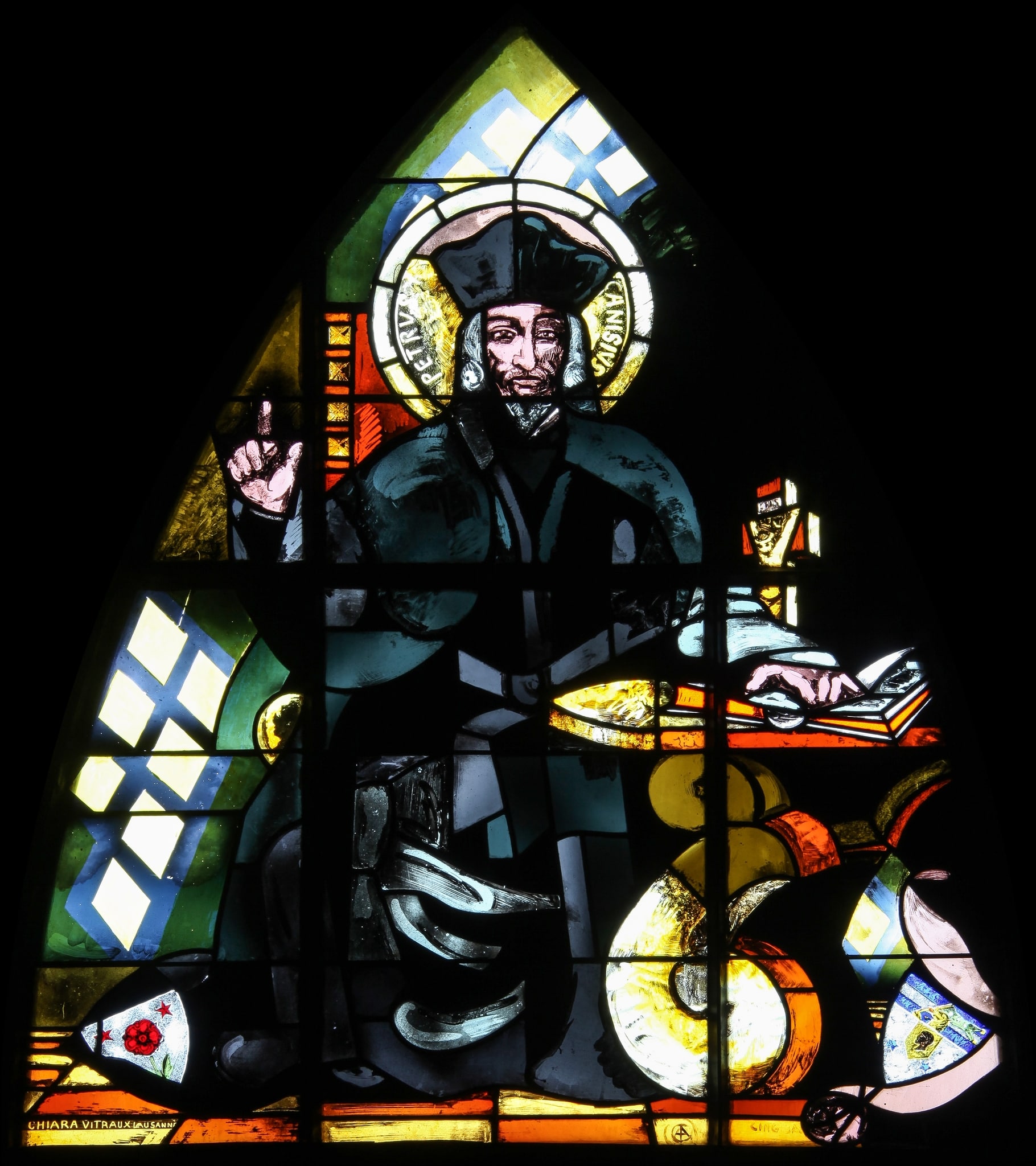 Ce vitrail a été réalisé en 1930 par Alexandre Cingria et l’atelier Chiara pour la paroi sud de la nef de l’église catholique Saint-Martin de Lutry.