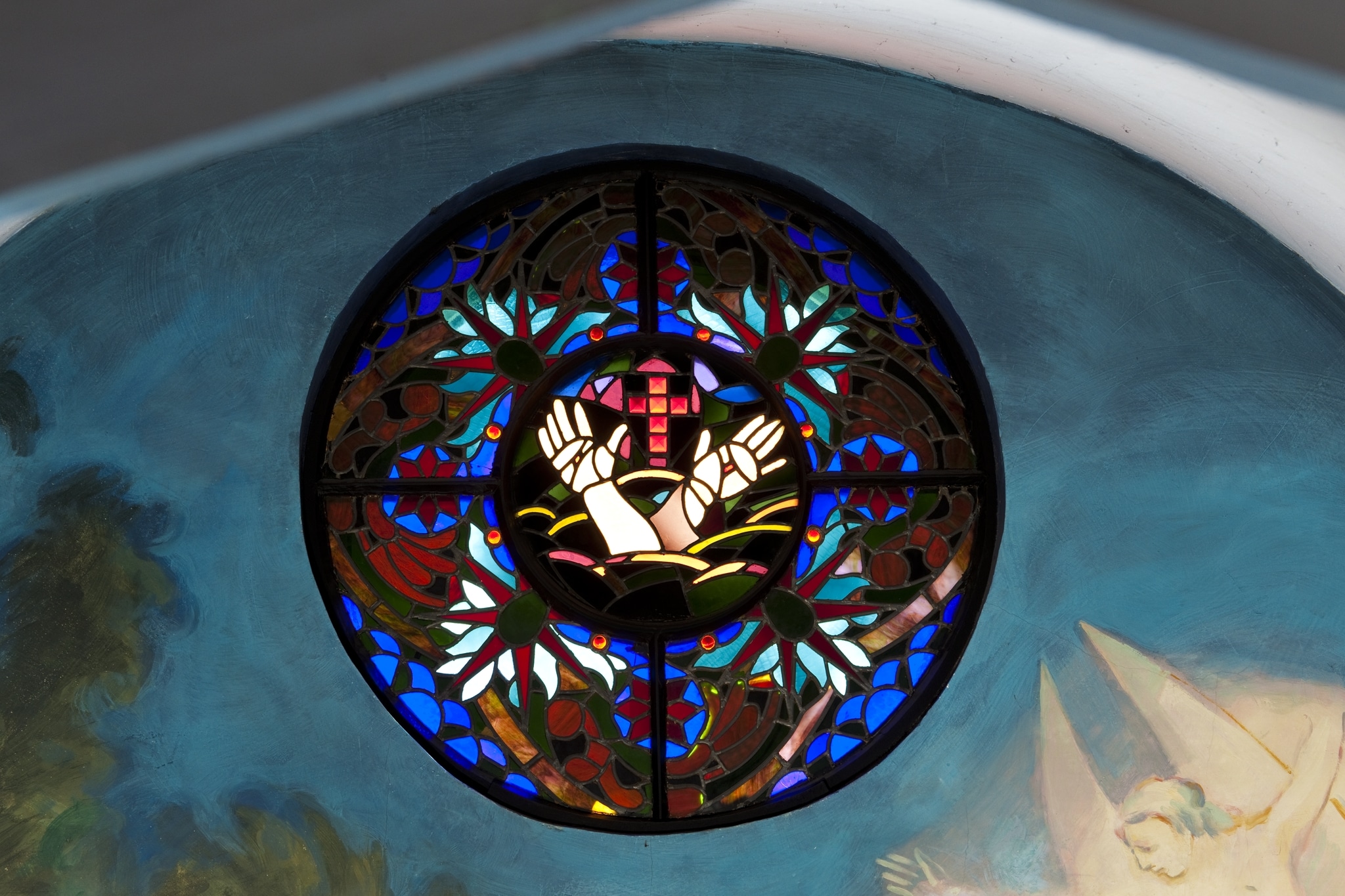 Ce vitrail a été réalisé par l’artiste genevois Alexandre Cingria et l’atelier Chiara de Lausanne pour l’une des sept ouvertures de la coupole surmontant le choeur hémisphérique de la nouvelle chapelle de l'Hôtellerie franciscaine à Saint-Maurice (ancien scolasticat puis Foyer franciscain), édifiée en 1940 par l’architecte romontois Fernand Dumas, également auteur de la restauration de l’ancienne chapelle entre 1929 et 1932.