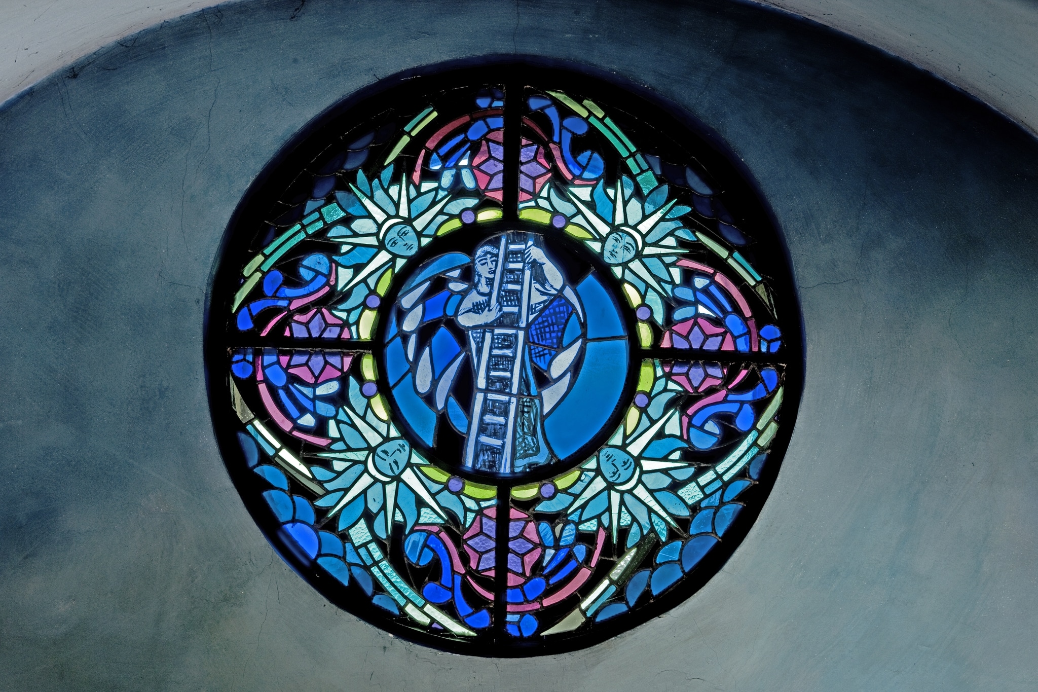 Au centre de la rose, un ange est représenté debout de face, les ailes déployées et tenant de ses deux mains une échelle posée debout devant lui.