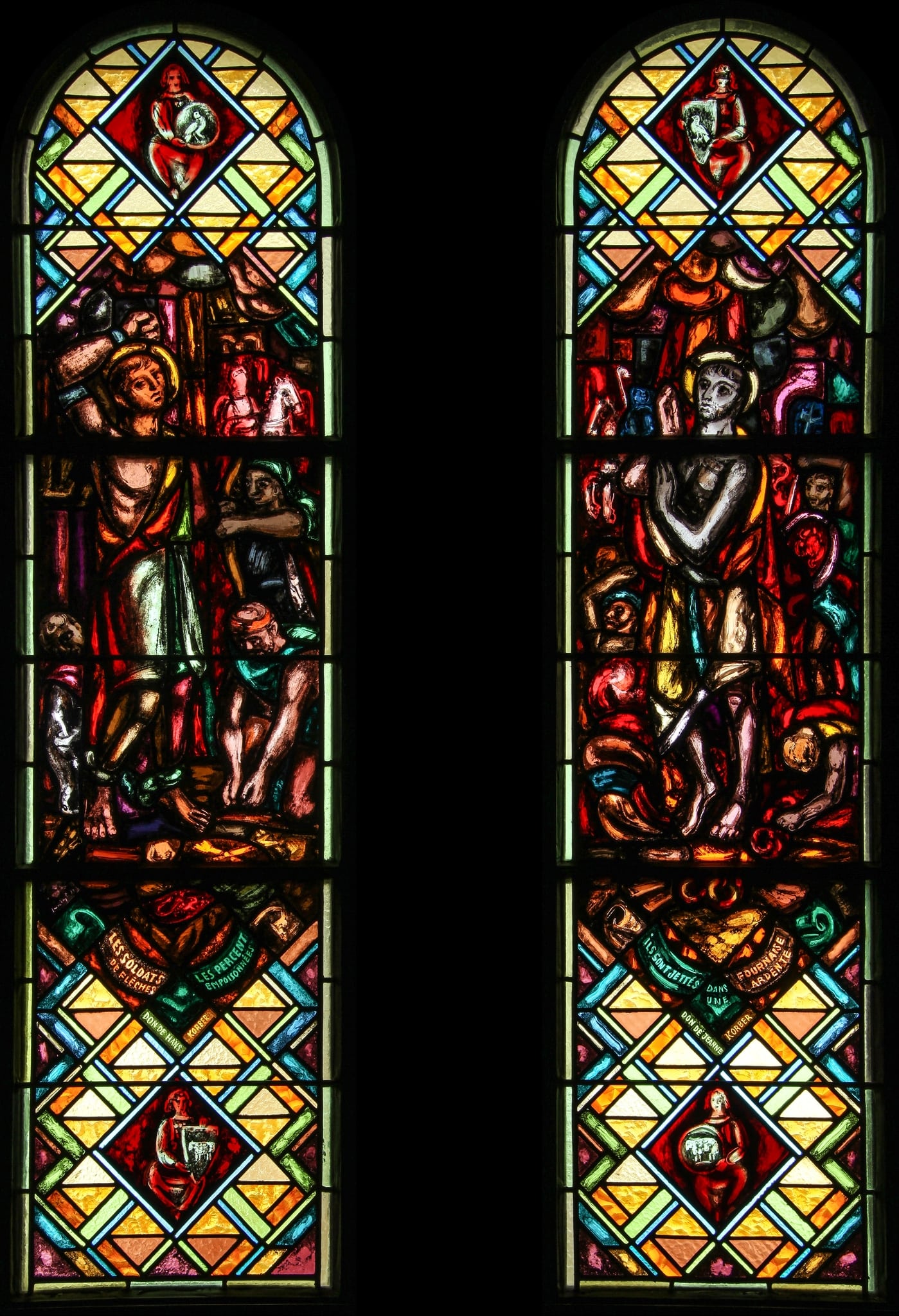 Sur la fenêtre de gauche, saint Côme ou Damien auréolé, les pieds et poings enchaînés, est martyrisé par les soldats romains qui le criblent de flèches empoisonnées. A droite, un archer le vise tandis qu’en dessous de lui, un autre bande son arc. Un troisième personnage est agenouillé derrière le saint. A l’arrière-plan à droite se devine un cavalier. Sur la fenêtre de droite, saint Côme ou Damien se tient debout au milieu des flammes, levant les mains et le regard vers le ciel. Il est entouré de plusieurs personnages qui s’agitent et s’écroulent à cause de la chaleur, tandis que le visage du saint reste impassible. A l’arrière-plan à droite, figure un soldat portant bouclier et bannière, alors qu’à gauche un cavalier est représenté.