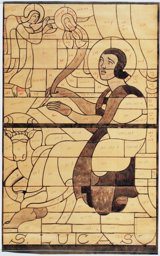 Il rédige le début de son évangile, inspiré par la Vierge et l’ange Gabriel : Luc, assis de profil à droite, écrit son évangile posé sur ses genoux. Il est accompagné à ses pieds de son attribut, le taureau. Il regarde en haut à gauche, inspiré par la Vierge et l’ange de l’Annonciation qui lui apparaissent.