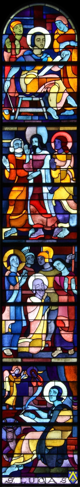 Ce vitrail se compose de quatre scènes relatant différents épisodes de la vie de saint Luc, avec, de haut en bas :