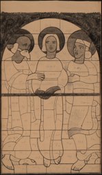 Matthias est choisi pour remplacer Judas dans le Collège apostolique : debout au centre, les traits juvéniles, Matthias se tient les mains croisées, et regarde vers Pierre portant une barbe blanche, debout à sa droite qui le tient par le bras et le choisit. Un autre apôtre est debout à sa gauche et le regarde.