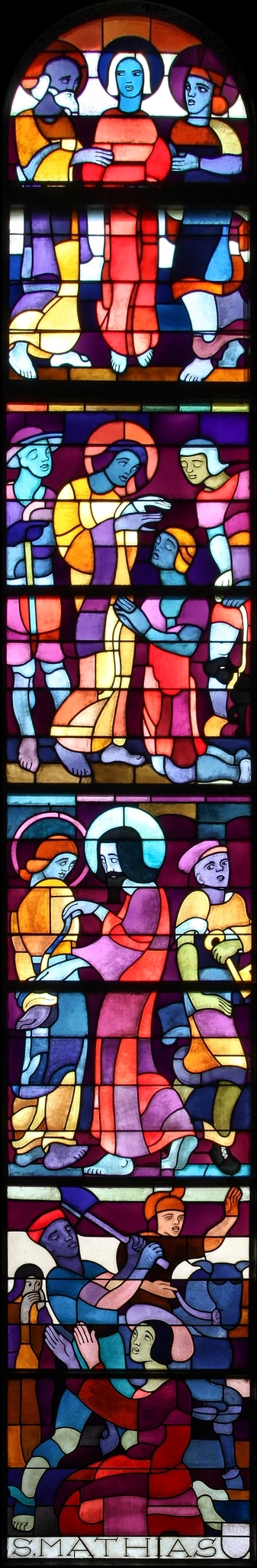 Ce vitrail se compose de quatre scènes relatant différents épisodes de la vie de saint Matthias, avec, de haut en bas :