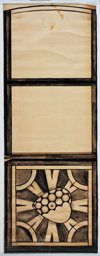 Pour cette rose monumentale, l’artiste semble avoir proposé deux maquettes au commanditaire, oeuvres qui sont aujourd’hui conservées au Musée d’Art et d’Histoire de Fribourg (no. d’inventaire : MAHF 1985-641 b et a). La première, figurant la croix centrale et deux propositions de fonds décoratifs pour les quatre angles (qu’il nomme : 1B et 2B), présente également deux variantes de bras de croix (appelées : 1A et 2A). La seconde illustre une troisième variante pour la croix (3A), qui sera celle choisie par les commanditaires, et quatre nouvelles propositions de fonds décoratifs (3B, 4B, 5B et 6B). C’est la variante 5B qui est préférée. Sur la base des choix du Conseil de Paroisse et du curé Zurkinden, Broillet réalise cinq cartons composant les différentes parties de la verrière (KF_392 ; KF_438 ; KF_439 ; KF_440 et KF_441). Comme cela se fait habituellement pour les verrières décoratives pour des raisons d’économie de moyens et de temps, il ne conçoit pas le dessin définitif de toute la rose, mais réalise chacun des éléments différenciés constituant le vitrail (le centre, une branche de la croix et un fond décoratif pour un des quatre angles), qui seront répétés par le verrier pour la composition de l’ensemble de la rose.