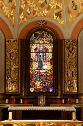 Dans le choeur, Fernand Dumas met le vitrail à l’honneur en imaginant un monumental retable très original, associant vitrail et panneaux sculptés. Pour cela, il perce le mur du chevet qui ne comprenait pas de fenêtre axiale à l’origine (Dumas, 1935) et conçoit un cadre en bois en légère saillie par rapport au mur, dans lequel s’intègre le vitrail, dont les panneaux sculptés et polychromés de François Baud composent les portes. Les vitraux latéraux, également de Cingria, complètent visuellement cet ensemble. Ce concept de vitrail-retable se retrouve également dans une autre église rénovée par Fernand Dumas et les artistes du Groupe de Saint-Luc en 1939, celle de Villars-le-Terroir dans le canton de Vaud, où le vitrail axial conçu par Gaston Thévoz est entouré d’un monumental panneau en bois peint par Gaston Faravel. Il s’agit dans les deux cas d’une reformulation moderne de la tradition du tableau-retable d’autel. Renonçant à la formule du retable peint conçu comme un élément mobilier séparable de l’architecture, les artistes du Groupe de Saint-Luc vont se tourner vers des techniques monumentales qui font corps avec elle, à l’instar de la peinture murale, du vitrail ou de la sculpture.