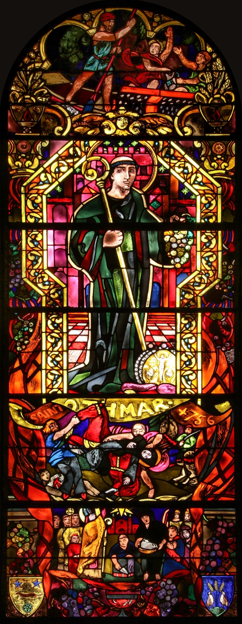 La verrière axiale est consacrée au saint patron de l’église, saint Othmar. Cingria y a représenté plusieurs épisodes de sa vie, inspirés de la vita rédigée par Gozbert le Jeune, moine de Saint-Gall, en 830, texte qui fut repris et affiné au cours du IXème siècle (Schubiger, 1999, p. 107). Les deux scènes des panneaux inférieurs illustrent le rôle qu’a joué le saint pour l’abbaye de Saint-Gall en y instituant la vie régulière pour les moines, en l’agrandissant et en la restaurant ; et l’attaque ordonnée par les comtes francs Warin et Ruthard, contre saint Othmar alors qu’il se rend auprès du roi Pépin. Ceux-ci le feront accuser à tort du crime de chair, provoquant son enfermement et son éloignement de l’abbaye de Saint-Gall. L’épisode du haut se réfère probablement à un miracle survenu durant le déplacement du corps de saint Othmar, dix ans après sa mort. Ce dernier ayant été condamné à vivre reclu dans une île du Rhin, où il décède, ses frères de Saint-Gall ont une vision du Seigneur leur demandant de ramener son corps au monastère. Lors du voyage de retour en bateau, ils échappent miraculeusement à une tempête, et épuisés décident de partager un repas, mais il ne restait qu’un minuscule flacon. Miraculeusement, celui-ci suffit à les abreuver tous en abondance (Vie de Saint Othmar, s.d.).