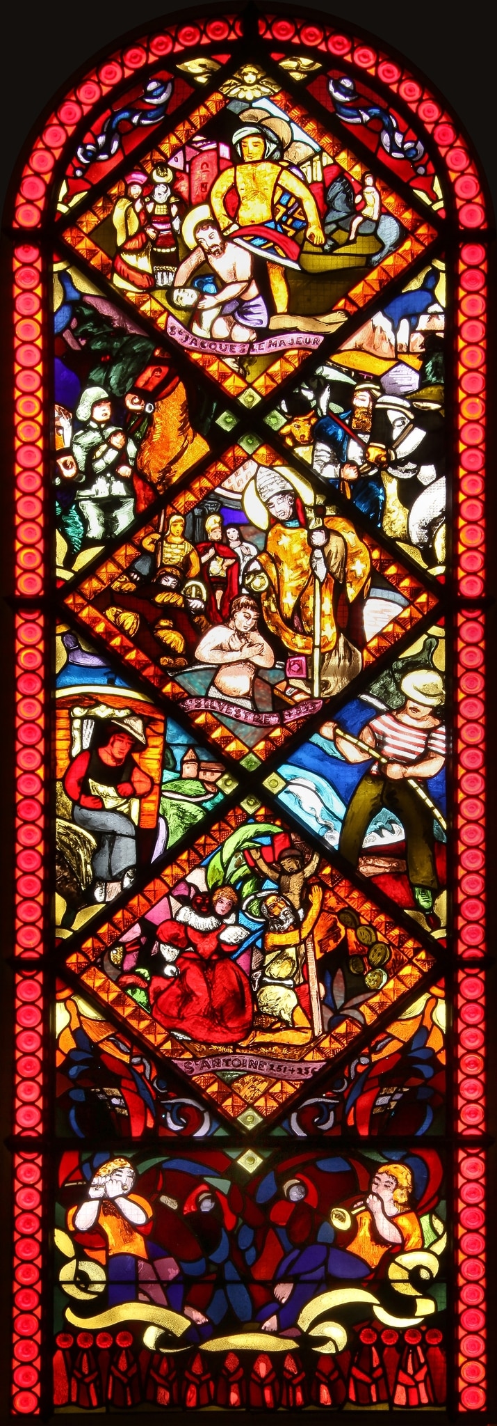 Cette verrière est composée de trois losanges superposés avec des scènes de la vie des saints Antoine le Grand, Sylvestre et Jacques le Majeur, désignés par des phylactères qui comportent également, pour les deux premiers, des indications sur les dates de vie du saint ou de l’épisode. En dessous de ces trois losanges, deux anges musiciens jouant de la flûte traversière et de la trompette sont représentés, au-dessus d’une procession de petits personnages stylisés dans les tons rouges.