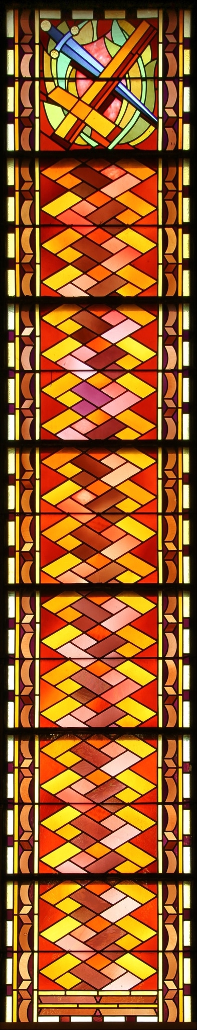 Il apparaît clairement que les vitraux ne sont pas l’élément principal de la décoration de l’église, contrairement à la céramique, traitée à la manière de la mosaïque, que l’on retrouve partout dans l’édifice. Bien qu’il s’agisse d’un choix esthétique délibéré, nous pouvons tout de même nous demander si c’est aussi par manque de moyens financiers que des vitraux géométriques (bien moins chers que des vitraux narratifs), ont été choisis.