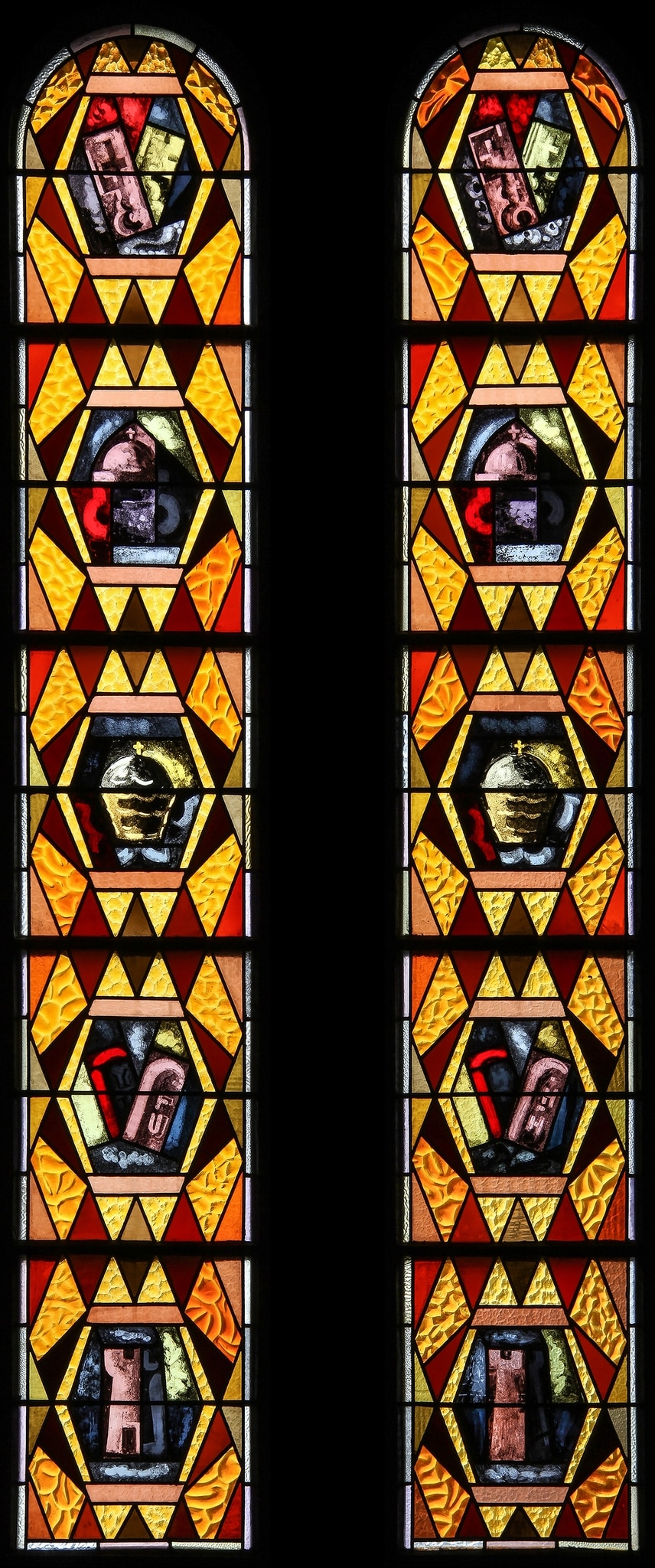 Fenêtre double en plein cintre composée de cinq panneaux comprenant chacun en leur centre un médaillon hexagonal sur un fond losangé. Chaque hexagone comporte un motif symbolique différent, peint à la grisaille. De bas en haut, on trouve une tour, les tables de la loi, la tiare pontificale, la représentation stylisée de la basilique Saint-Pierre de Rome, reconnaissable par son dôme et sa colonnade et les clés de saint Pierre. Les symboles se répètent à l’identique sur la fenêtre de gauche et sur celle de droite, avec de légères variations.