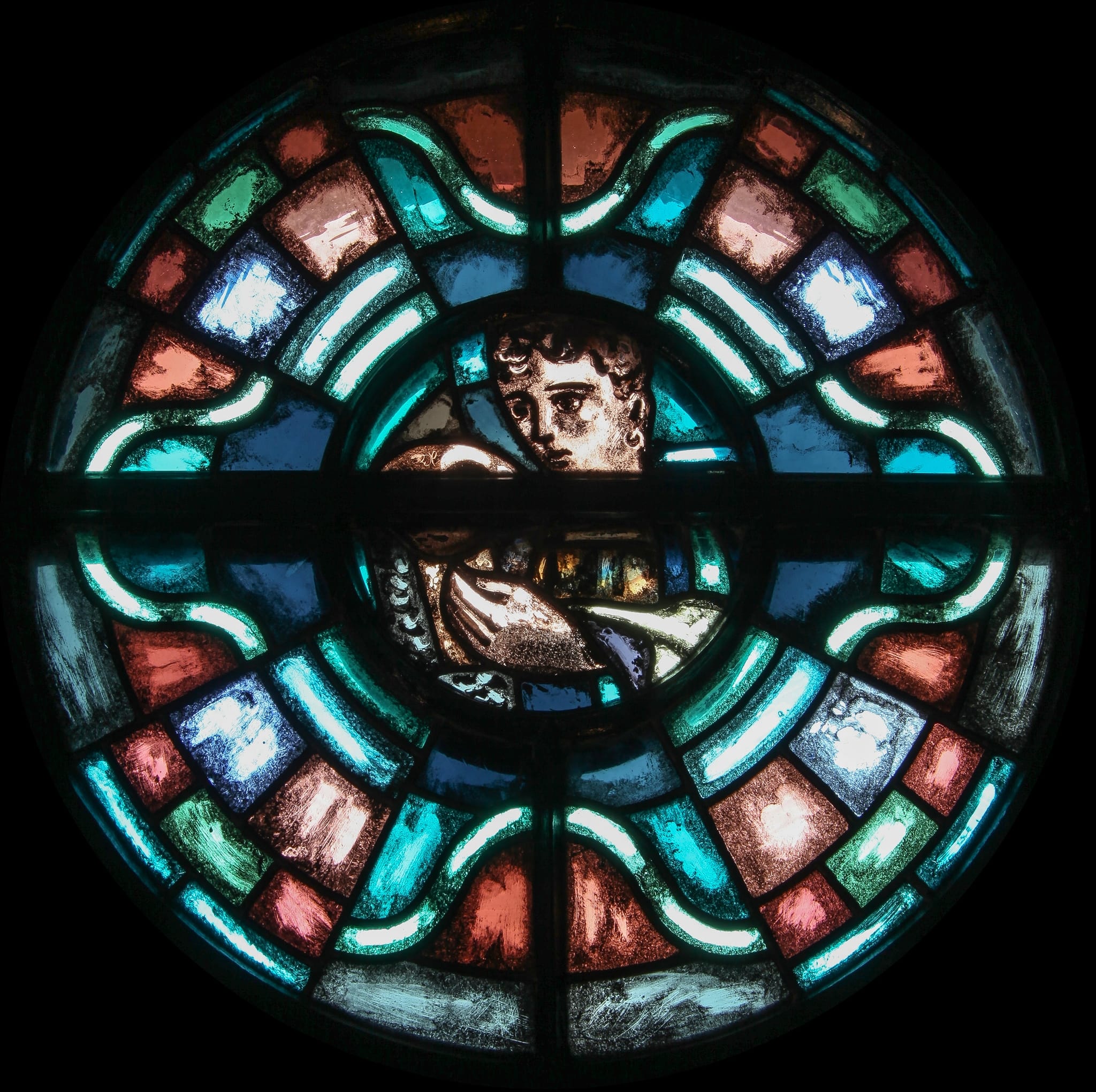 Les huit vitraux du baptistère – le huit étant un chiffre se retrouvant souvent dans l’architecture des baptistère puisqu’il est associé à la Résurrection – ont comme rôle premier de moduler la lumière arrivant dans cet espace dont l’importance liturgique est capitale. L’iconographie y joue un rôle secondaire, comme l’indique la place réduite qu’occupent les parties figurées par rapport aux zones ornementales. Cet aspect semble être assez récurrent chez Landry, qui envisage le vitrail avant tout dans une perspective décorative. Il optera pour un parti similaire à Travers pour les vitraux ornant l’espace dévolu au baptistère (GSL_202). Utilisant des tons à dominantes vertes, bleues, brunes et roses, qui évoquent l’eau et se marient parfaitement avec la peinture murale qui se déploie tout autour, il utilise une forte grisaille sur les cinq vitraux qui se situent du sud à l’ouest, tout en laissant nus les trois vitraux de l’est au nord. Conçus uniquement avec des verres industriels à textures aux teintes pastel, ils permettent un éclairage plus soutenu et une arrivée de lumière par l’arrière par rapport au positionnement de l’entrée. Landry choisit pour les médaillons centraux des représentations symboliques chrétiennes ou des figures emblématiques du christianisme, à l’instar du motif du poisson et de l’ancre, de la colombe du Saint-Esprit, du Bon berger et de la Vierge et du Christ. La présence répétée du poisson, que l’on retrouve dans le vitrail central, le seul comportant une inscription, évoque aussi l’eau du baptême et l’entrée symbolique dans la communauté chrétienne.