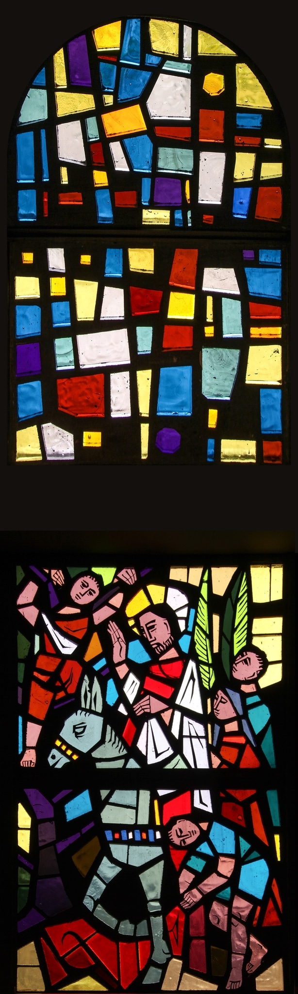 Sur la partie inférieure, donnant sur la nef, le Christ assis sur un âne entre à Jérusalem, accueilli par plusieurs personnes brandissant des palmes, alors que Zachée le regarde debout sur un arbre. Au premier plan, un homme dépose son manteau au rouge au sol devant le Christ.