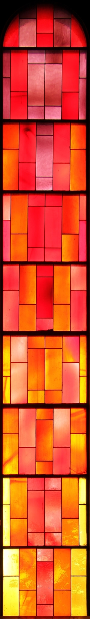 Fenêtre géométrique en plein-cintre divisée en neuf panneaux constitués de verres colorés rectangulaires de différentes tailles, disposés verticalement. Le vitrail est traité dans des teintes chaudes avec des dominantes de rouge et orange, nuancées par des pièces de verre rose au centre, de violet et rouge-brun dans les extrémités. Plusieurs verres présentent des variations de teintes avec des insertions de couleurs différentes. Un subtil effet de dégradé anime la fenêtre, plus claire dans sa partie inférieure grâce à l’utilisation de verres plus transparents, tandis que plus l’on remonte en direction du sommet de la fenêtre, plus les teintes sont foncées et les verres opaques.