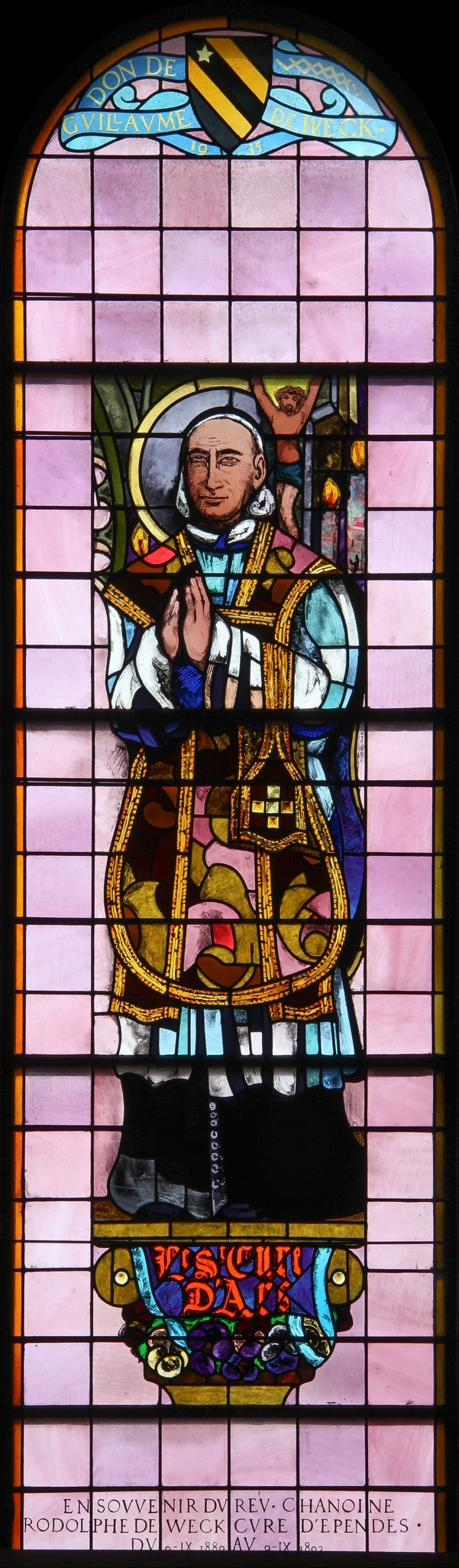 Cette verrière est consacrée au curé d’Ars, prêtre catholique français qui a oeuvré entre autres pour favoriser la beauté des lieux de culte. Elle été offerte par Guillaume de Weck en hommage au chanoine Rodolphe de Weck, qui fut curé d’Ependes. Le choix de ce saint, proclamé patron de tous les curés de l’univers, n’est pas anodin et était certainement une façon de souligner l’excellent travail de son aïeul au sein de la paroisse.