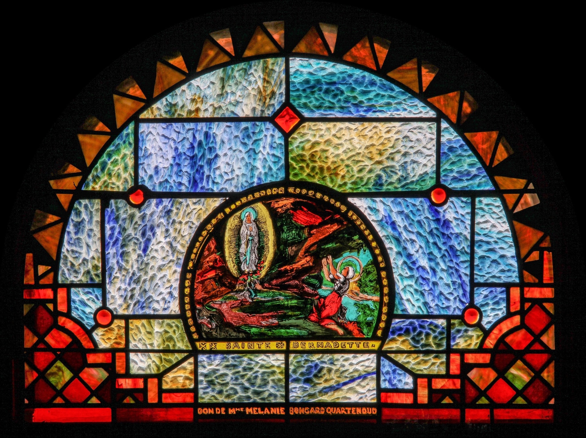 Vitrail en demi-cercle composé d’un médaillon au centre et encadré d’une large bordure ornementale. A droite du médaillon figure Bernadette Soubirous nimbée, agenouillée, les bras levés devant l’apparition de la Vierge entourée de rayons dorés et sous les pieds de laquelle coule une source. L’arrière-plan traité dans des tons de brun, vert et gris suggère l’intérieur d’une grotte.