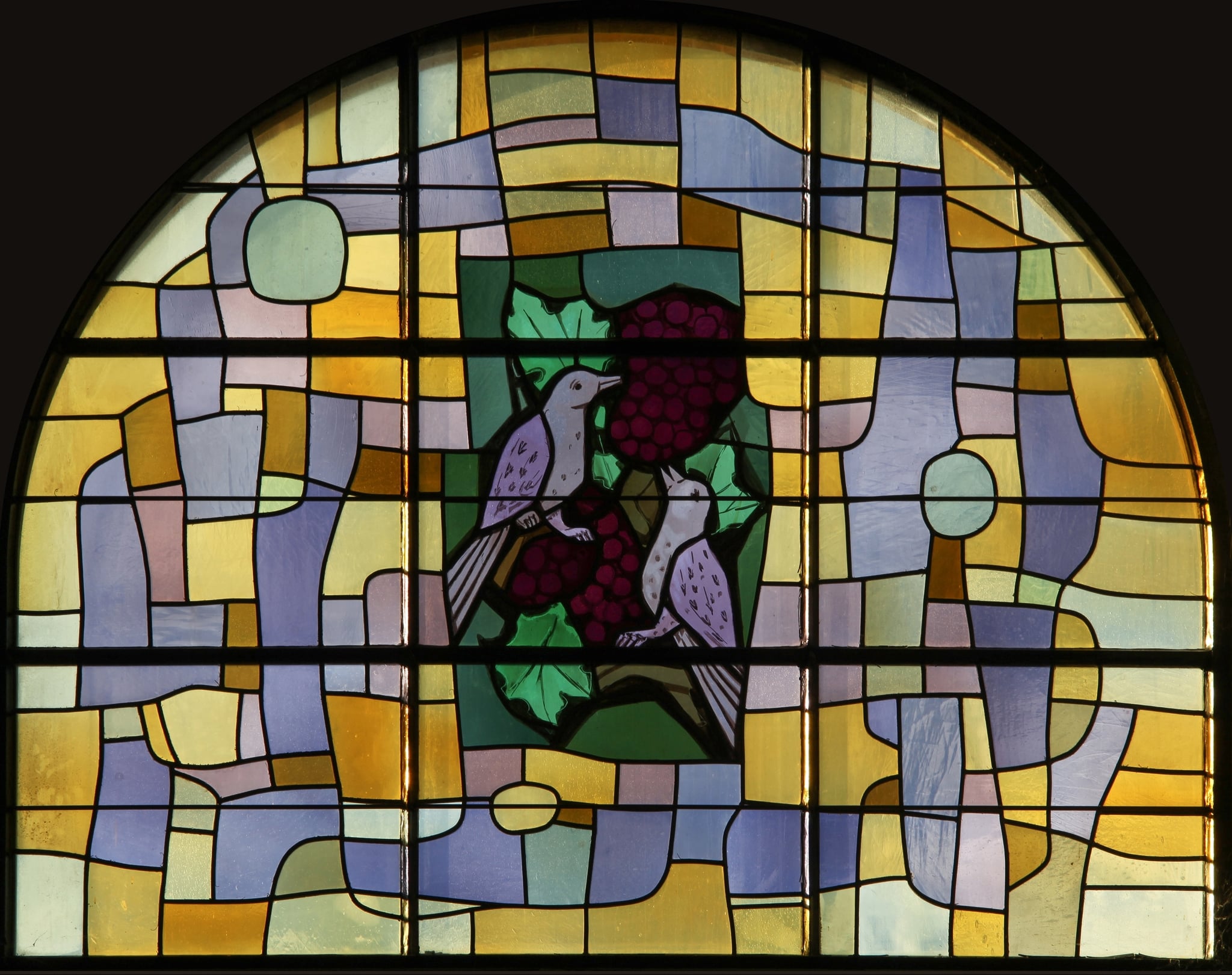 Au centre du vitrail abstrait, sur un fond vert, deux oiseaux posés sur des ceps de vigne garnis de feuilles et de grappes, picorent des raisins.