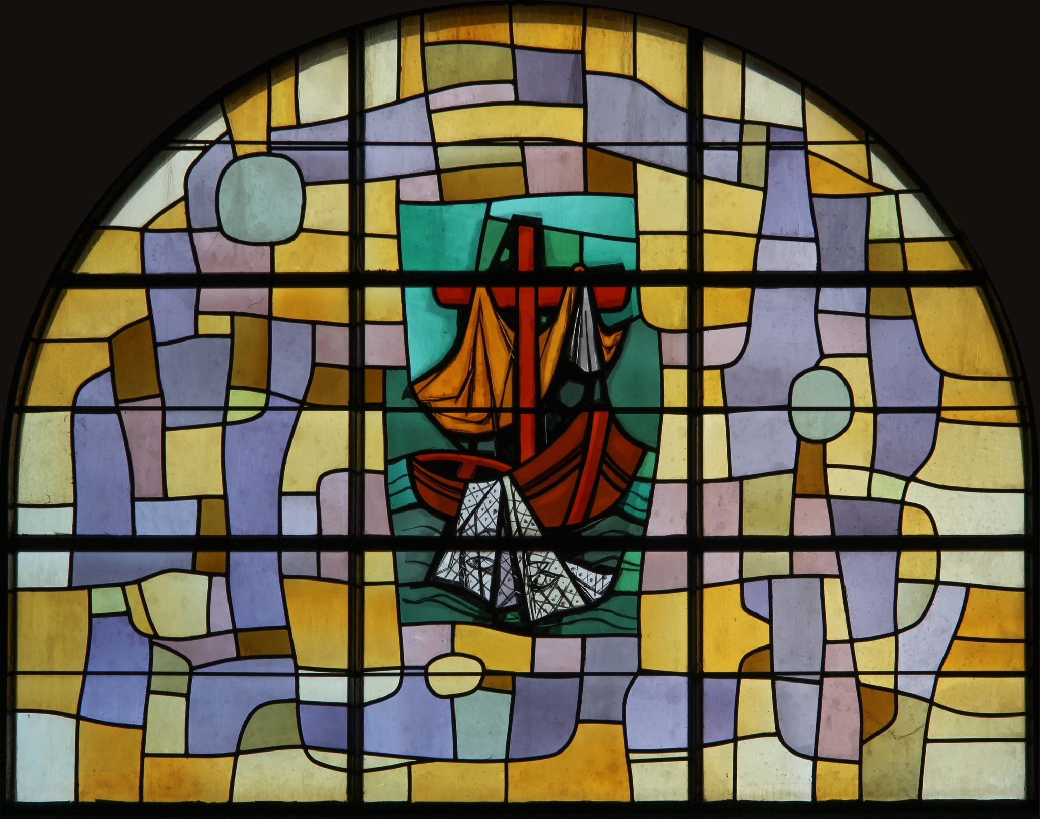 Au centre du vitrail abstrait, sur un fond turquoise, une barque en bois flotte en eau calme, avec au centre un mât en forme de croix auquel sont suspendues des voiles. Un filet partiellement immergé et rempli de poissons est retenu sur le bord de la coque du bateau.