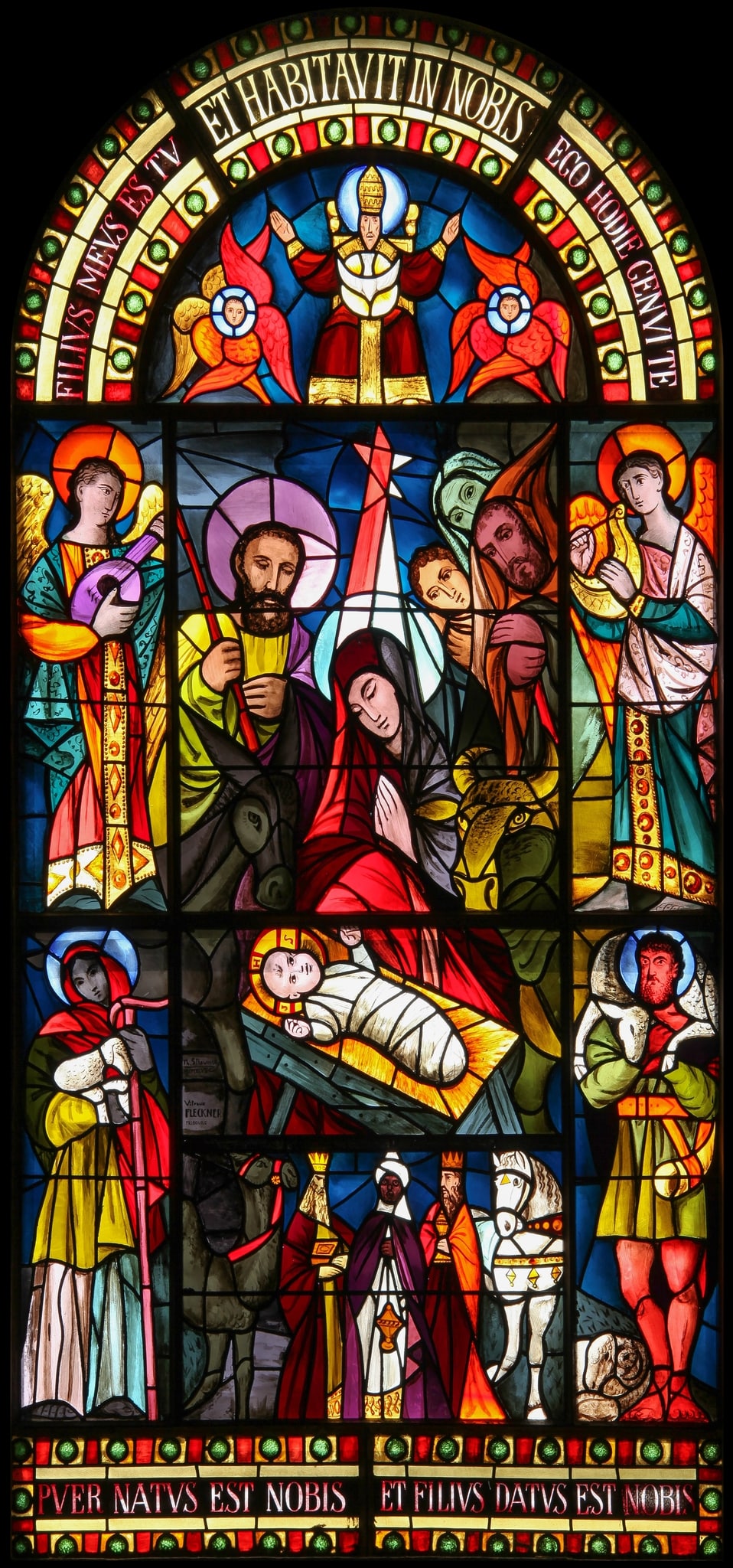 Sur la scène médiane, Joseph, appuyé sur un bâton et Marie en prière, sont agenouillés devant l’Enfant Jésus, emmailloté et couché sur une mangeoire, encadré par l’âne et le boeuf. L’étoile de Bethléem les éclairent et à l’arrière-plan à droite, trois personnages se penchent vers le nouveau-né.