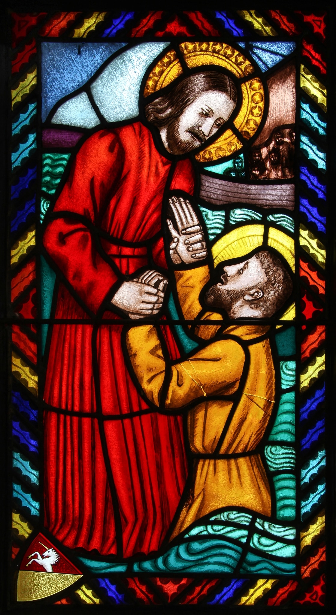 La série de petits vitraux dans le vestibule illustre, à l’exception de la Remise des clefs à saint Pierre, des scènes bibliques liées à l’eau (Baptême du Christ, Lavement de pieds, Rencontre du Christ avec la Samaritaine). Pouvant être vues de très près et à hauteur de regard, l’artiste crée des scènes en plan rapproché offrant au spectateur un accès à chaque épisode, comme s’il en était le témoin direct. Il reprend en cela les cadrages serrés imaginés en 1934 pour son chemin de croix de l’église Notre-Dame-de-l’Assomption à Sommentier, parti qu’il réutilisera en 1939 pour ses stations de l’église de Saint-Blaise, et en 1943 pour celles de Monfaucon.