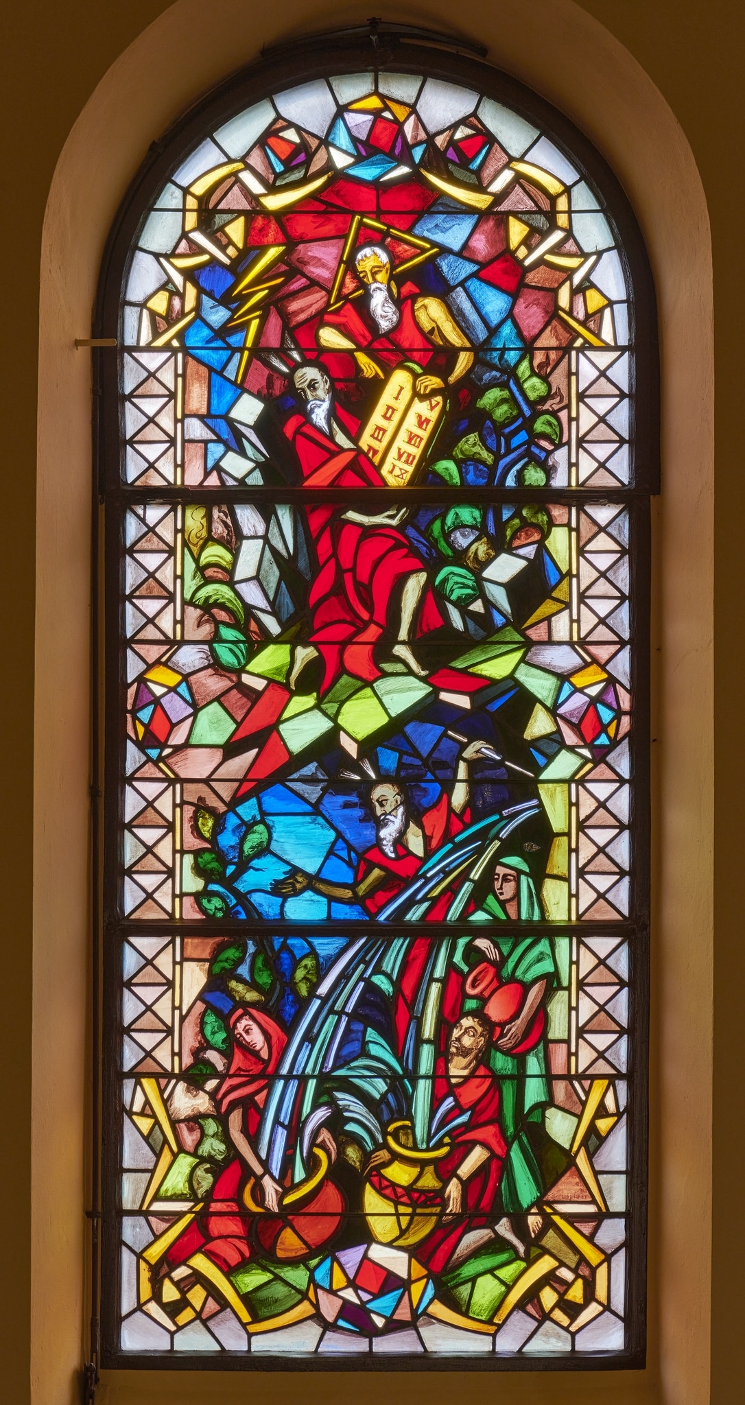 En haut, Moïse, agenouillé à gauche et drapé d’une tunique rouge, détourne la tête de laquelle émerge deux rayons, tandis que Dieu lui apparaît sous les traits d’un homme à la barbe blanche, la tête auréolée d’un nimbe triangulaire, désignant les tables de la loi qu’il lui remet. La scène se déroule dans un paysage de montagne représenté par des rochers et de la végétation. Le ciel bleu se teinte de rouge autour de l’apparition divine, avec un éclair à gauche. Sous les pieds de Moïse, le sol géométrisé s’interrompt pour laisser place à la scène inférieure. Celle-ci illustre le Miracle du rocher. Moïse, au centre, frappe la roche à droite de son bâton, faisant jaillir de l’eau qui est recueillie dans de grandes cruches par une femme et un homme israélite agenouillés au premier plan, vêtus de rouge. Une deuxième femme en vert attend debout derrière eux avec sa cruche.