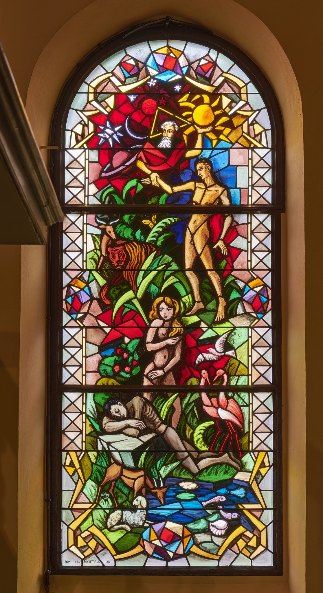 A l’exception des deux fenêtres situées au niveau de la tribune, dont les dimensions sont différentes, l’artiste conçoit ses dix fenêtres suivant un schéma identique. Deux scènes narratives très colorées sont superposées au centre de la fenêtre et ressortent sur un fond ornemental géométrique composé de verres pâles, agrémenté d’une bordure très originale ornée de motifs de pierres précieuses. Par cette construction claire et la disposition des riches coloris en un équilibre des tons chauds et froids, l’artiste assure la lisibilité du dessin malgré une iconographie complexe, allant de l’Ancien au Nouveau testament. Le cycle commence avec le deuxième vitrail situé à gauche de la nef, illustrant la Création du monde, de l’Homme et de la Femme, puis se poursuit en direction du choeur jusqu’à la Visitation. La lecture reprend à droite de la nef en direction de la tribune avec la Nativité et l’arrivée des Mages à Bethléem pour s’achever avec la Transfiguration et Pierre prêchant aux peuples du monde. Il est complété, au niveau de la tribune, par la représentation de la statue de Notre-Dame de Lausanne et du Roi David, côté nord-ouest, et de l’Agneau sur le livre aux sept sceaux avec les symboles des Évangélistes, côté sud-est. Nous ignorons si l’artiste a reçu des directives précises concernant les scènes à représenter, mais l’on peut supposer que cela a été le cas, à l’instar d’un cycle comparable par son ampleur et sa complexité, celui de Haute-Nendaz (1946) (par exemple GSL_373 ; GSL_374), pour lequel l’artiste avait travaillé sous la supervision du chanoine Marcel Michelet, docteur en philosophie et théologie (Germanier, 2000, p. 13-14).