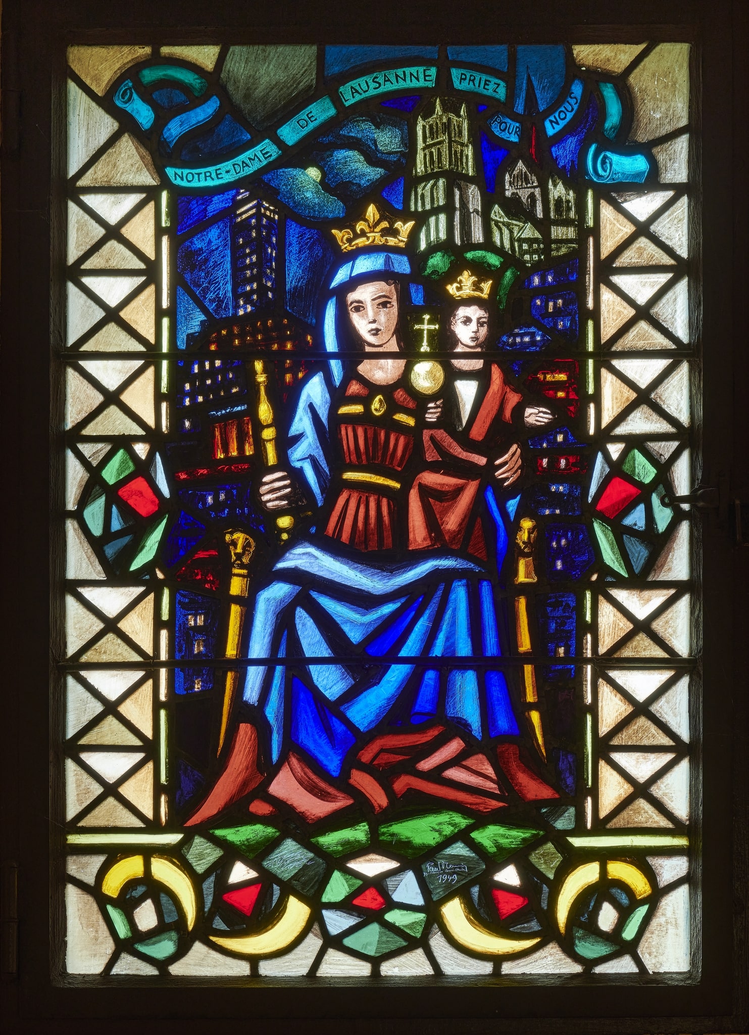Dans la partie inférieure, la Vierge de la statue de l’église catholique Notre-Dame de Lausanne est représentée au premier plan, figurant devant une vue nocturne de la ville illuminée, reconnaissable par la tour Bel-Air en haut à gauche, et par la cathédrale en haut à droite. La Vierge est vêtue de bleu et d’ocre et tient un sceptre de la main droite, tandis que le Christ, debout sur son genou gauche, tient dans sa main droite le globe surmonté d’une croix. Une banderole flotte dans le ciel au-dessus de la ville, et des gemmes ornent la bordure en pointe de diamant qui encadre le vitrail, dans des tons clairs.