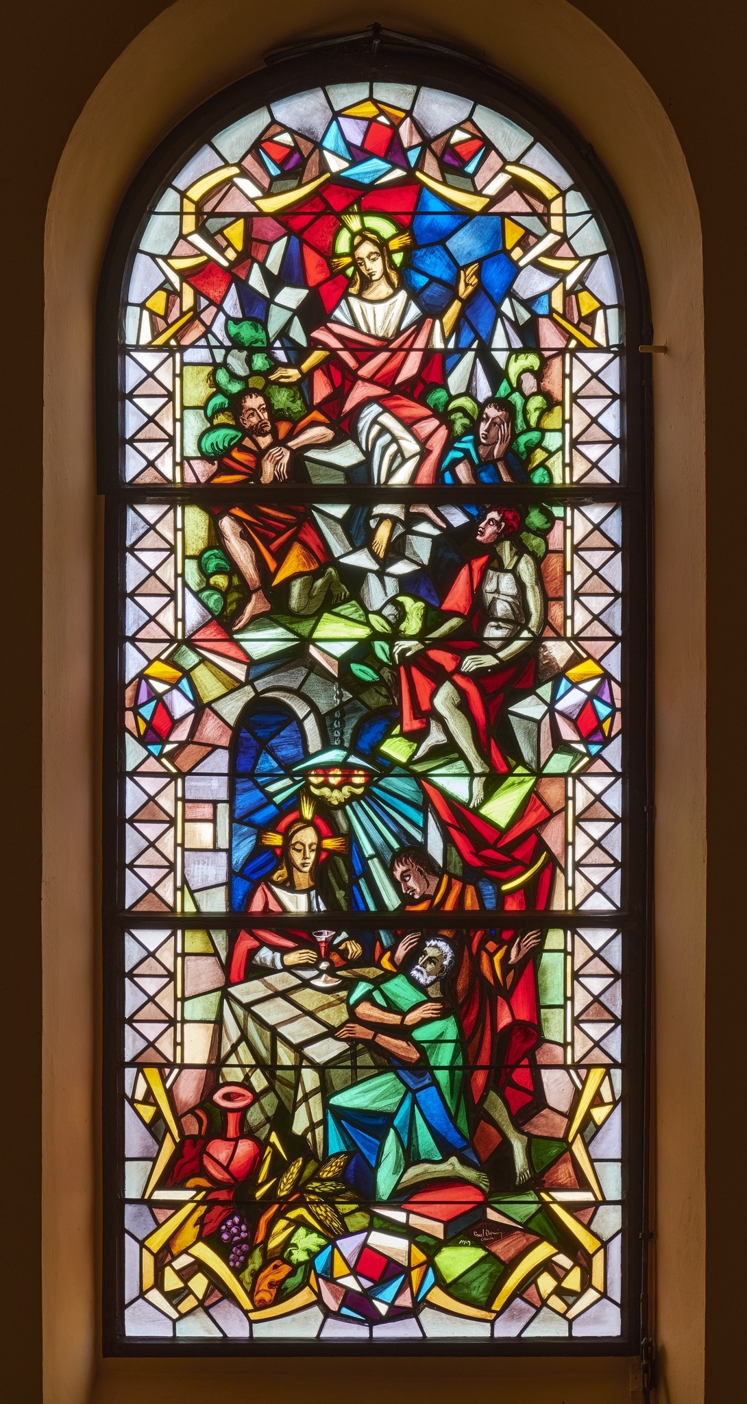 En haut, le Christ auréolé assis sur un rocher, s’adresse à trois disciples placés autour de lui et l’écoutant. Il lève sa main gauche en signe de bénédiction et l’autre en direction de l’un des auditeurs, agenouillé contre le rocher à gauche. La scène se déroule dans un paysage naturel avec des arbres et des montagnes à l’arrière-plan. Sous les disciples, le sol géométrisé s’interrompt pour laisser place à la scène inférieure. Celle-ci illustre le Christ placé derrière une table recouverte d’une nappe à carreaux, regardant une coupe de vin rouge posée devant lui. Deux disciples, l’un vêtu de vert et l’autre d’orange, assistent à la scène, exprimant par leur geste l’étonnement et la crainte. La scène se déroule à l’intérieur d’une pièce éclairée par une lampe entourée d’un halo de rayons bleus et turquoise. Un rideau rouge est visible à droite ainsi que, au premier plan à gauche, des symboles eucharistiques : une cruche, des grappes de raisins et des épis de blé.