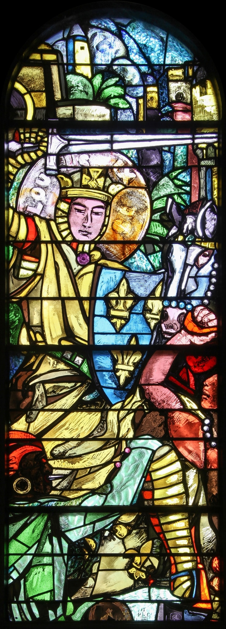 Ce vitrail dédié à Louis IX, tout comme celui qui lui fait pendant dans le choeur, consacré à saint Maurice et également dessiné par Cingria, s’inscrit dans le cadre de la rénovation de l’édifice par l’architecte Fernand Dumas, entre 1930 et 1932. A la fin des années 1920, la Société Libre, association privée qui gère les biens de la paroisse, envisage un rafraîchissement de l’édifice construit en 1883-1884 et une nouvelle décoration plus au goût du jour (Aubry, Frochaux, Gans, Tharin, 1984, n.p.). C’est le Fribourgeois Dumas et l’artiste vaudois Gaston Faravel, tous deux membres de la Société Saint-Luc, qui obtiendront le mandat. Cette attribution n’est certainement pas étrangère au fait que le nouveau curé de la paroisse, Louis Glasson, grand amateur d’art, en est lui même membre (Societas Sancti Lucae, 1929, p. 4). Faravel réalise la nouvelle polychromie de l’édifice, accompagnée de décors peints sur la tribune des orgues et l'arc du choeur, consistant en une succession de motifs narratifs disposés dans des médaillons, selon une formule typique de l'artiste, ainsi qu’un chemin de croix en peinture sous-verre achevé en 1932 (Glasson, 1932).