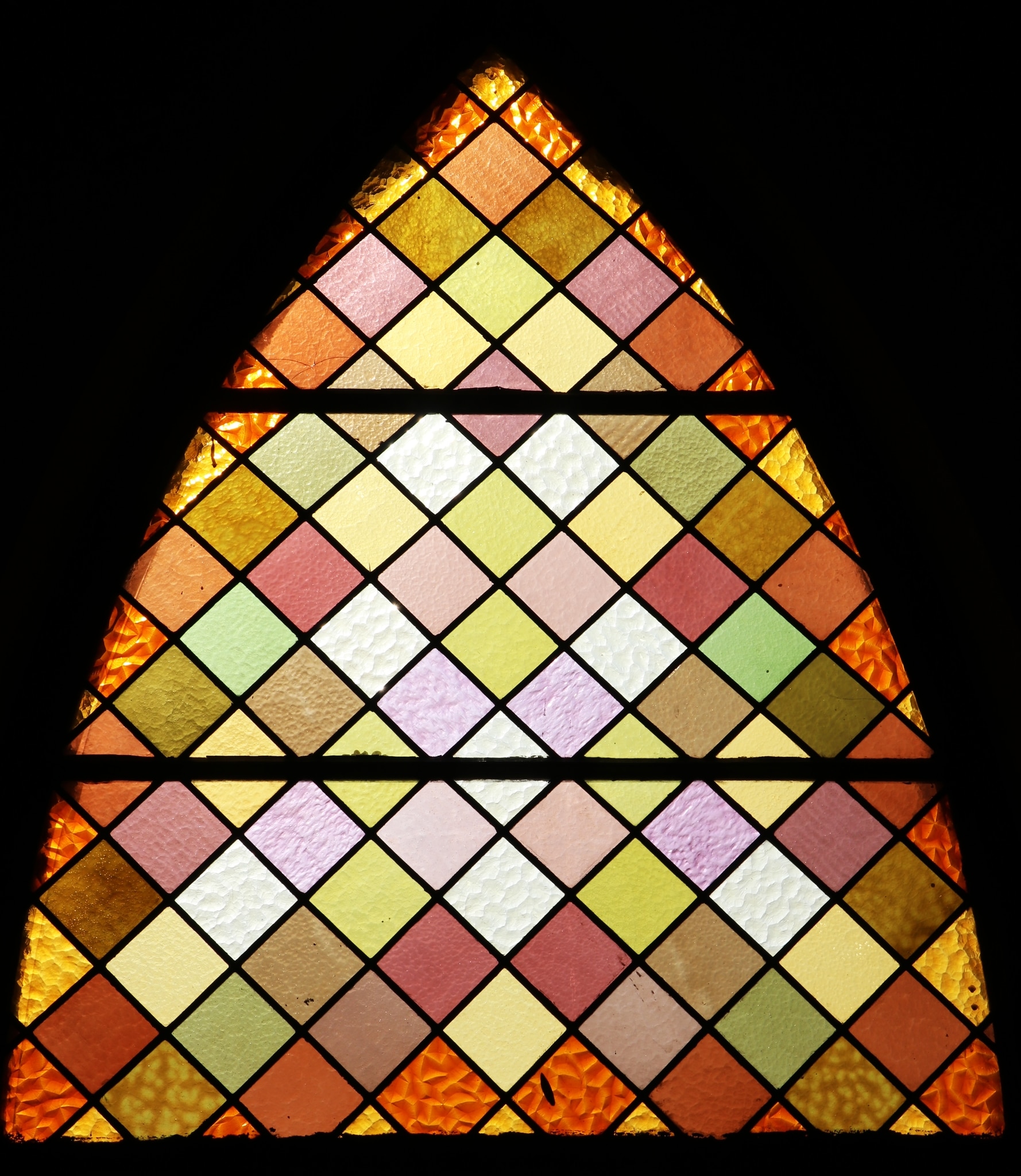 Cette baie en arc en tiers-point est composée d’un vitrail à losanges colorés de différentes nuances de teintes (jaune, or, blanc, mauve, rose et vert) élaboré avec des verres de différentes textures.
