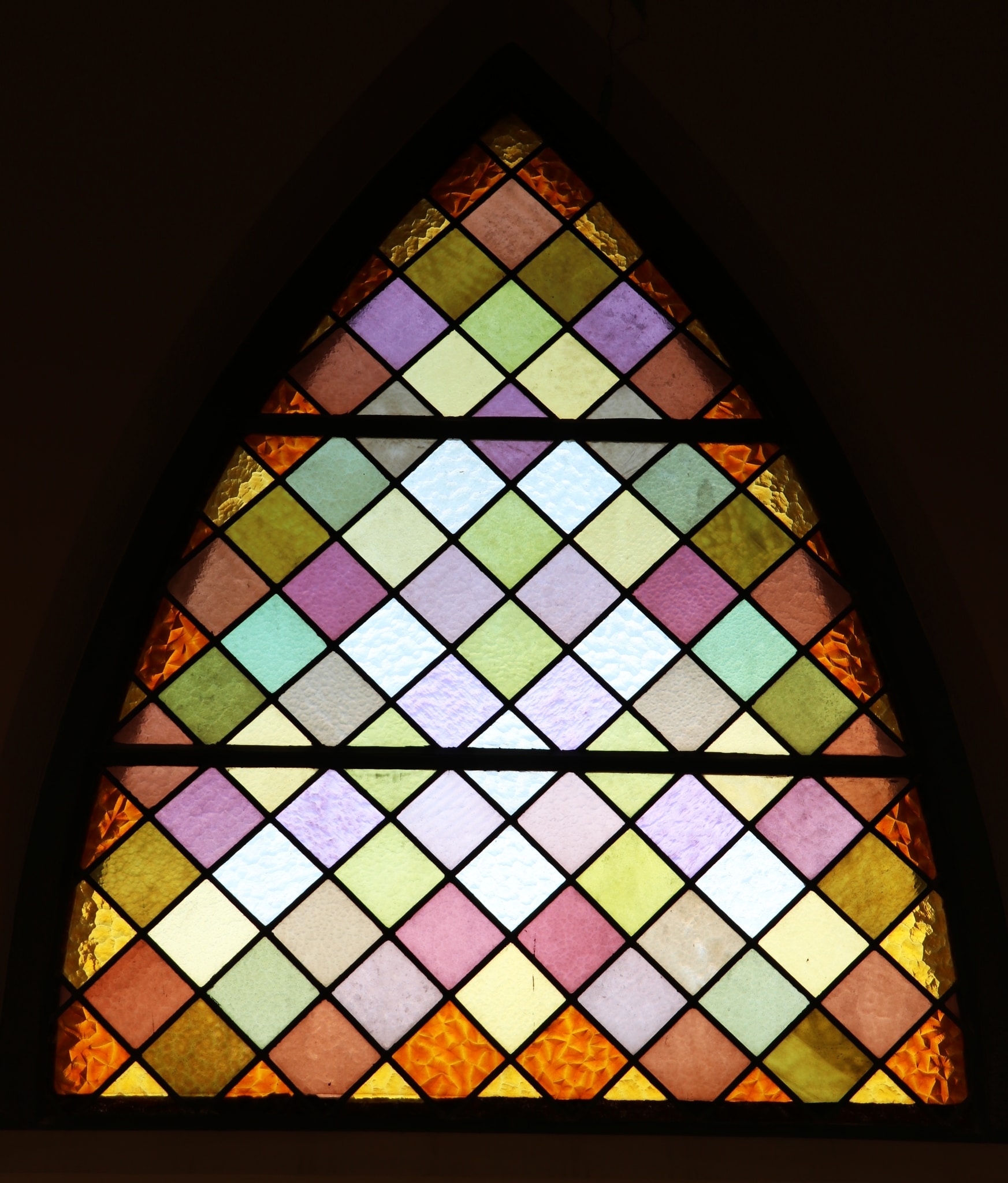 Cette baie en arc en tiers-point est composée d’un vitrail à losanges colorés de différentes nuances de teintes (jaune, or, blanc, mauve, rose et vert) élaboré avec des verres de différentes textures.