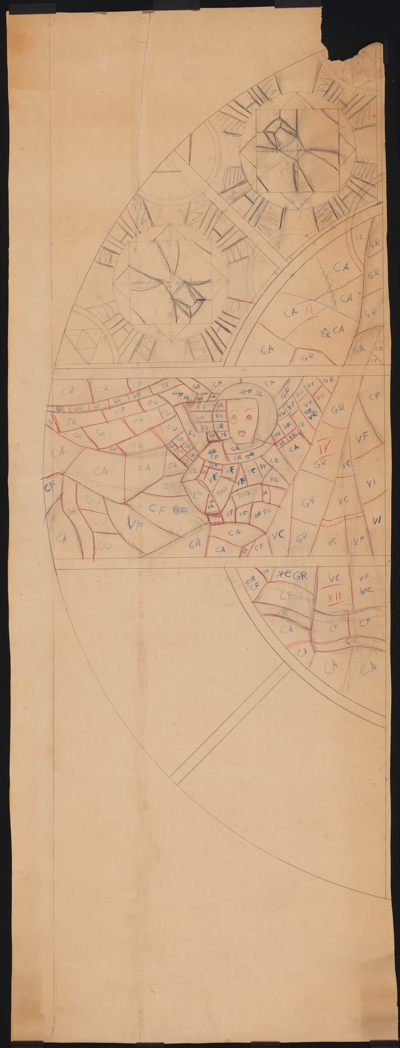 Ce carton correspond à la partie gauche de la rose consacrée à sainte Cécile, située sur la tribune des orgues de l’église Saint-Maurice de Bussy. Donation de la société de chant la Cécilienne, elle a été réalisée par l’artiste fribourgeois Gaston Thévoz en collaboration avec l’atelier Kirsch et Fleckner (Thévoz, 1938a), lors de la construction de la nouvelle église par l’architecte phare du Groupe de Saint-Luc, Fernand Dumas, en 1937-1938(Lauper, 2012, p. 284).