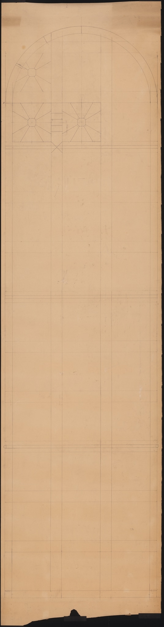 Ce carton est typique du mode de travail de l’atelier Kirsch & Fleckner, dont l’objectif est de fournir les indications nécessaires à la conception du futur vitrail, en évitant la répétition inutile des mêmes motifs. Ce carton renseigne ainsi sur les dimensions de la baie et de ses éléments constitutifs, l’emplacement des futures barlotières, ainsi que sur les quelques éléments décoratifs qui y figurent. Seuls trois motifs du quadrillage de l’arrière-plan sont dessinés, puisqu’ils se répètent sur l’ensemble de la fenêtre.