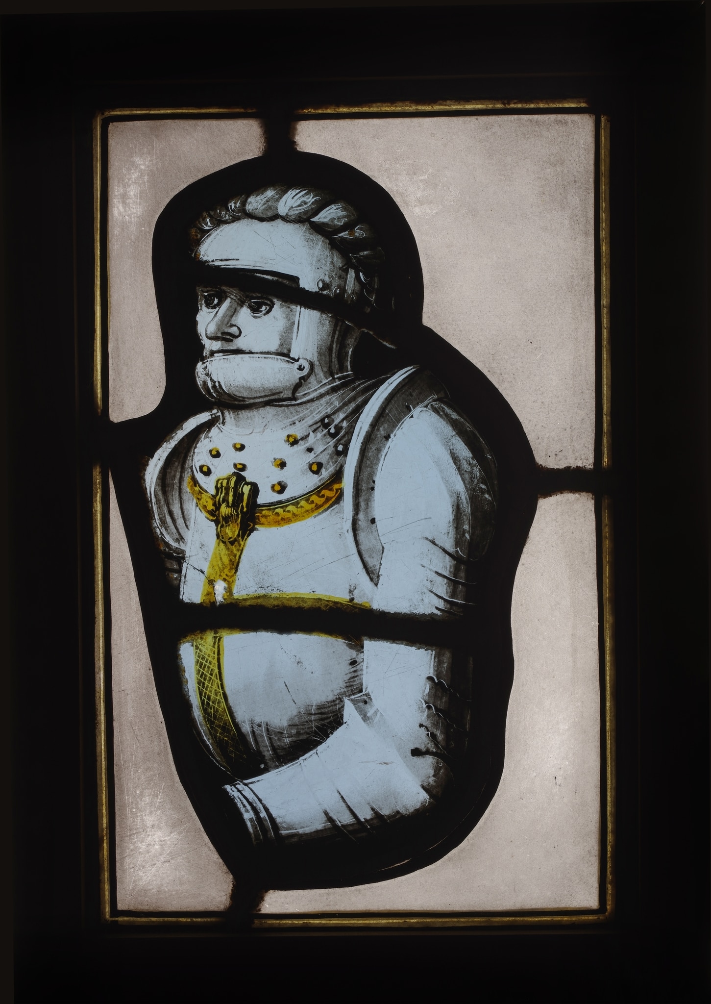 Fragment de vitrail représentant le buste d’un soldat, vêtu d’une armure et d’un heaume.