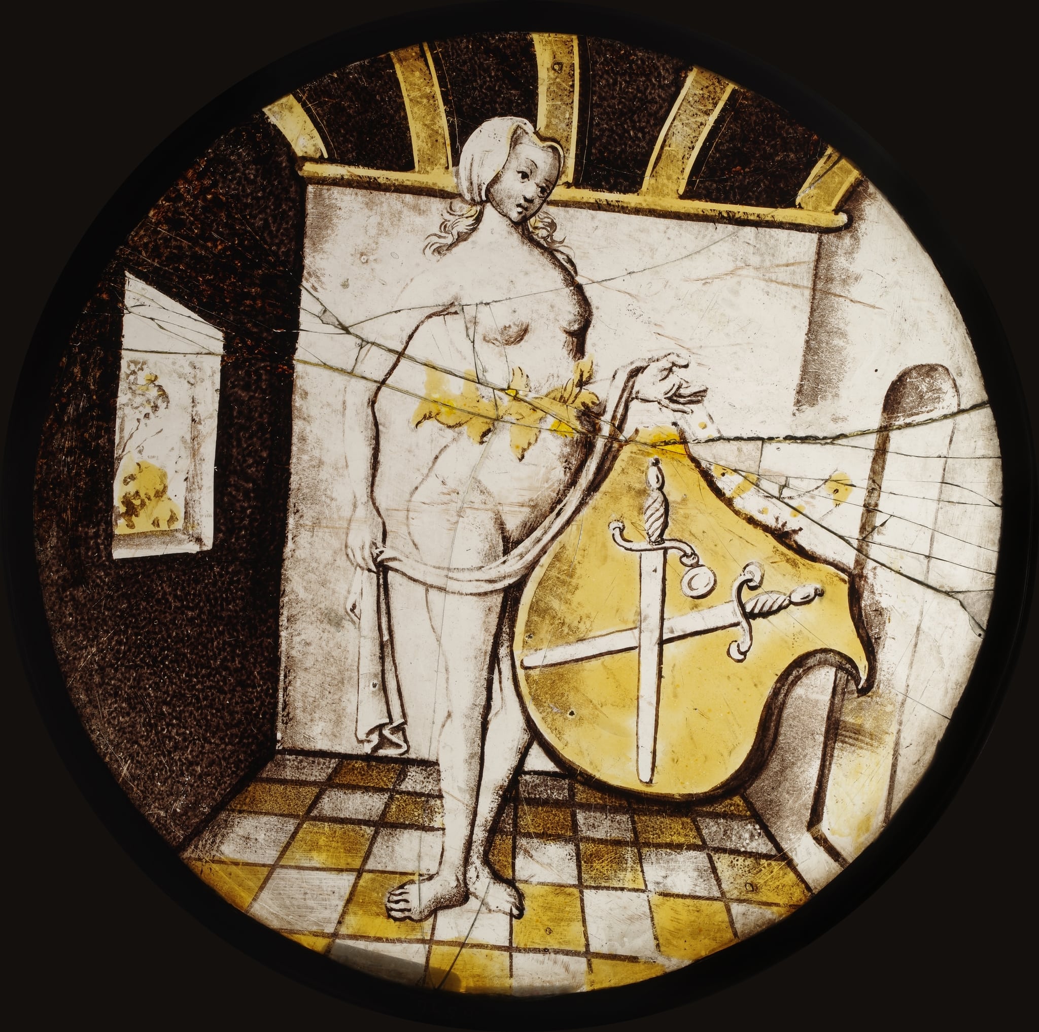 Médaillon monolithe circulaire représentant une figure féminine nue en pied se tenant au centre d’une pièce à sol carrelé, dont les parois sont percées à gauche d’une fenêtre et à droite d’une porte. Elle porte une coiffe, à la taille entourée d’une ceinture de feuillage et tient un voile ainsi qu’un écu armorié.