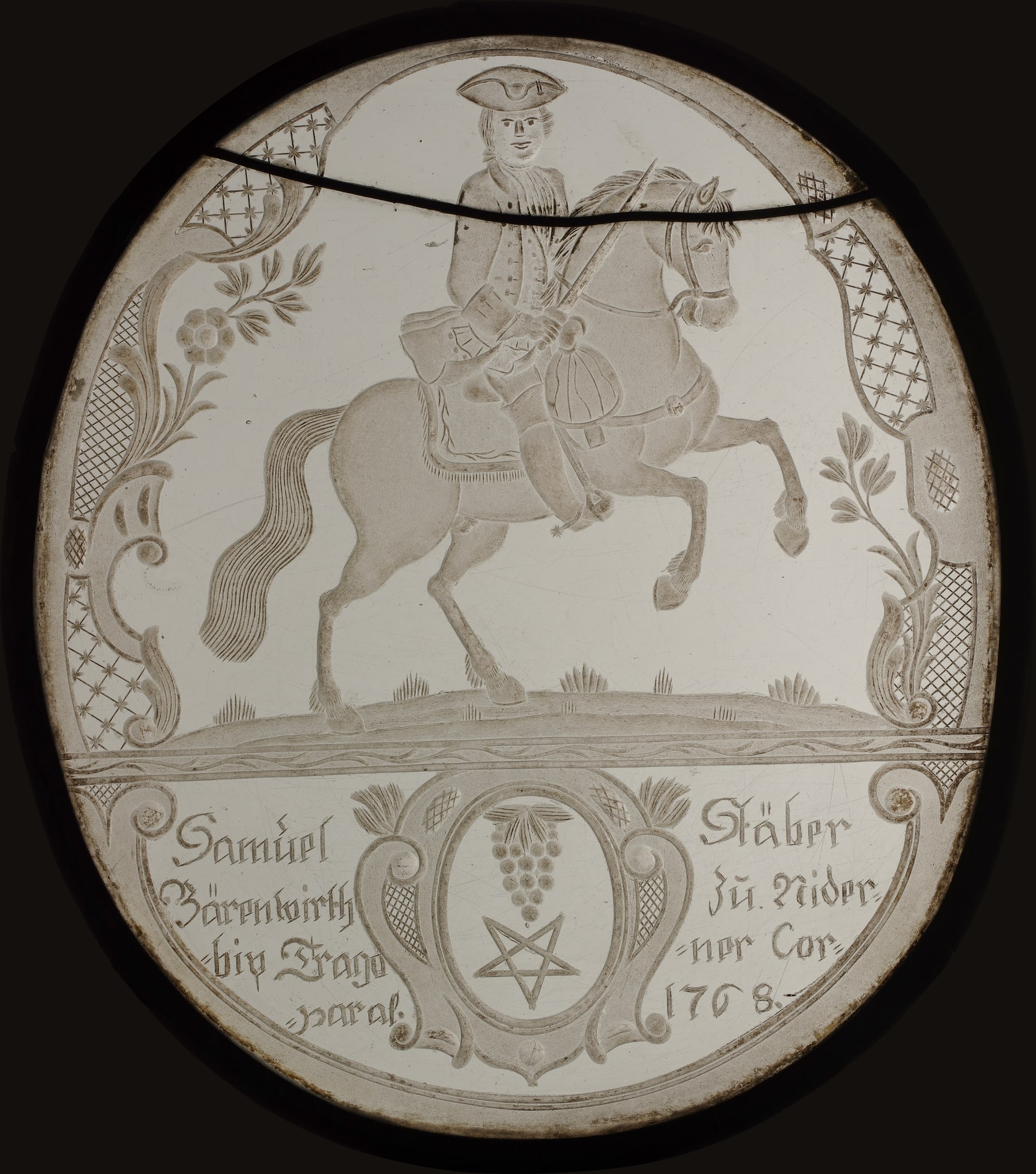 Dans le sillage de la prospérité économique que connaît la campagne bernoise et ses habitants au cours du XVIIIe siècle, cette nouvelle forme de vitrail venue de Bohème ou de Silésie se développe, attestant de la richesse de leur propriétaire (Paravicini-Stähelin, 1926, p. VIII). Ronds, ovales ou rectangulaires, ces panneaux gravés correspondent aux envies de lumière et de clarté dans les intérieurs du XVIIIe siècle. Ils sont élégamment et sobrement ornés d’inscriptions des donateurs, de citations bibliques, d’écus armoriés et d’ornements, parfois rehaussés à la grisaille (Rutsch, 1947, p. 5). Cet art populaire a décliné dès le XIXe siècle, dans un contexte de troubles politiques et d’essor croissant de l’industrie (Rutsch, 1947, p. 4).