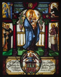 Vitrail aux armes de Bernhard Stalder avec la Vierge à l’Enfant entourée de quatre saints