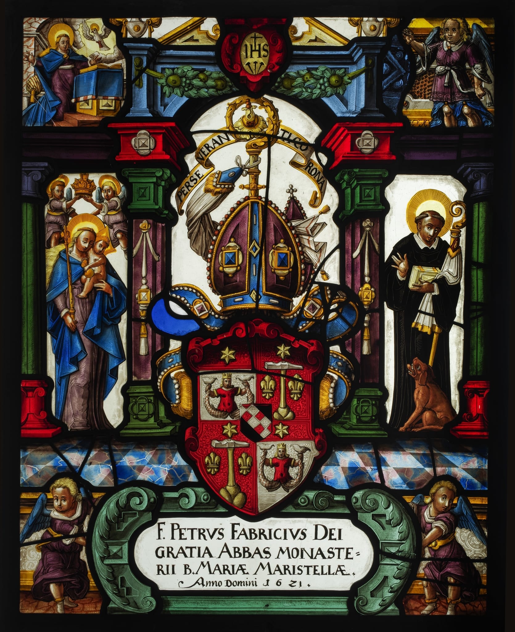 F. PETRVS FABRICIVS DEI / GRATIA ABBAS MONASTE= / RII B.MARIAE MARISTELLAE. / Anno Domini 1621. (en bas)