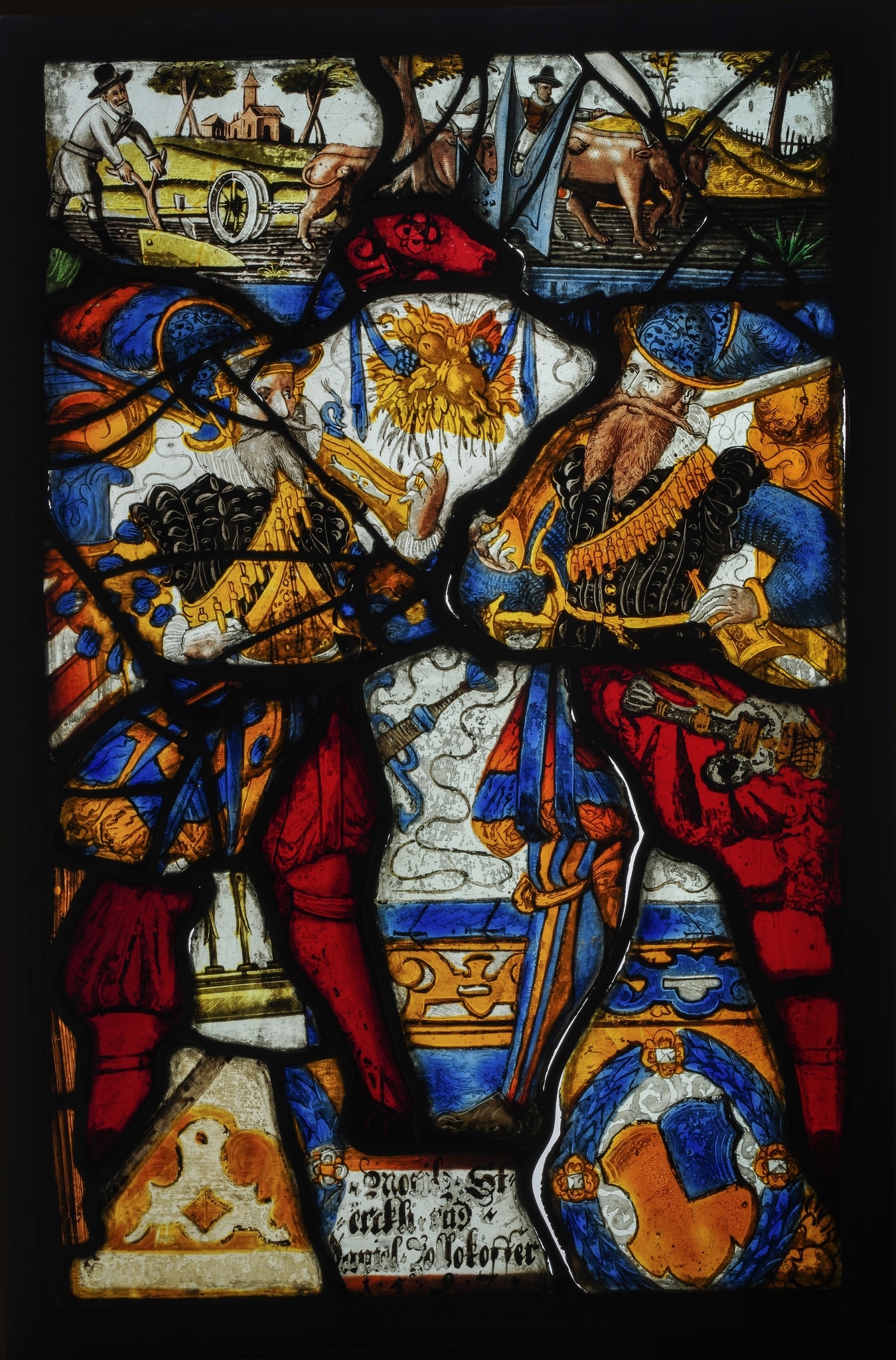 Ce panneau a été restauré à l’aide de nombreux plombs de casse et de pièces disparates (bas gauche et haut) qui rendent sa lecture difficile. La partie supérieure, composée de remplois, ne permet pas de définir l’activité professionnelle des donateurs du vitrail. L’inscription dans la partie basse indique qu’il s’agit d’une donation de Moritz Sterckli (?) et de Daniel Zollikofer. Sterckli n’est pas identifié et ses armoiries manquent. L’écu de Zollikofer correspond aux armes connues de la famille de commerçants de Saint-Gall (DHBS, 1934, p. 451). Compte tenu de ses nombreux homonymes, il ne peut cependant pas être identifié avec certitude.