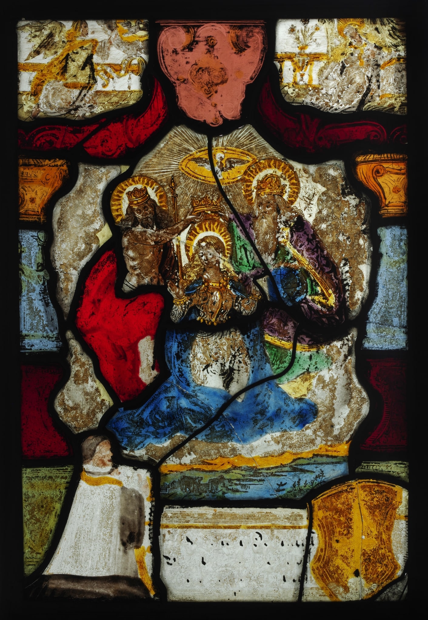 Vitrail rectangulaire représentant dans une nuée, au-dessus d’un paysage lacustre, le Couronnement de la Vierge Marie, en présence de la Sainte Trinité, avec à gauche le Christ et à droite Dieu le Père. La scène est encadrée de deux colonnes soutenant un arc en accolade, dont les écoinçons figurent l’Annonciation, avec à gauche l’archange Gabriel et à droite Marie agenouillée devant un pupitre. Dans le soubassement se trouve un cartouche avec une inscription effacée du donateur, accompagnée de part et d’autre d’une représentation de ce dernier agenouillé en prière en costume liturgique et de ses armes.
