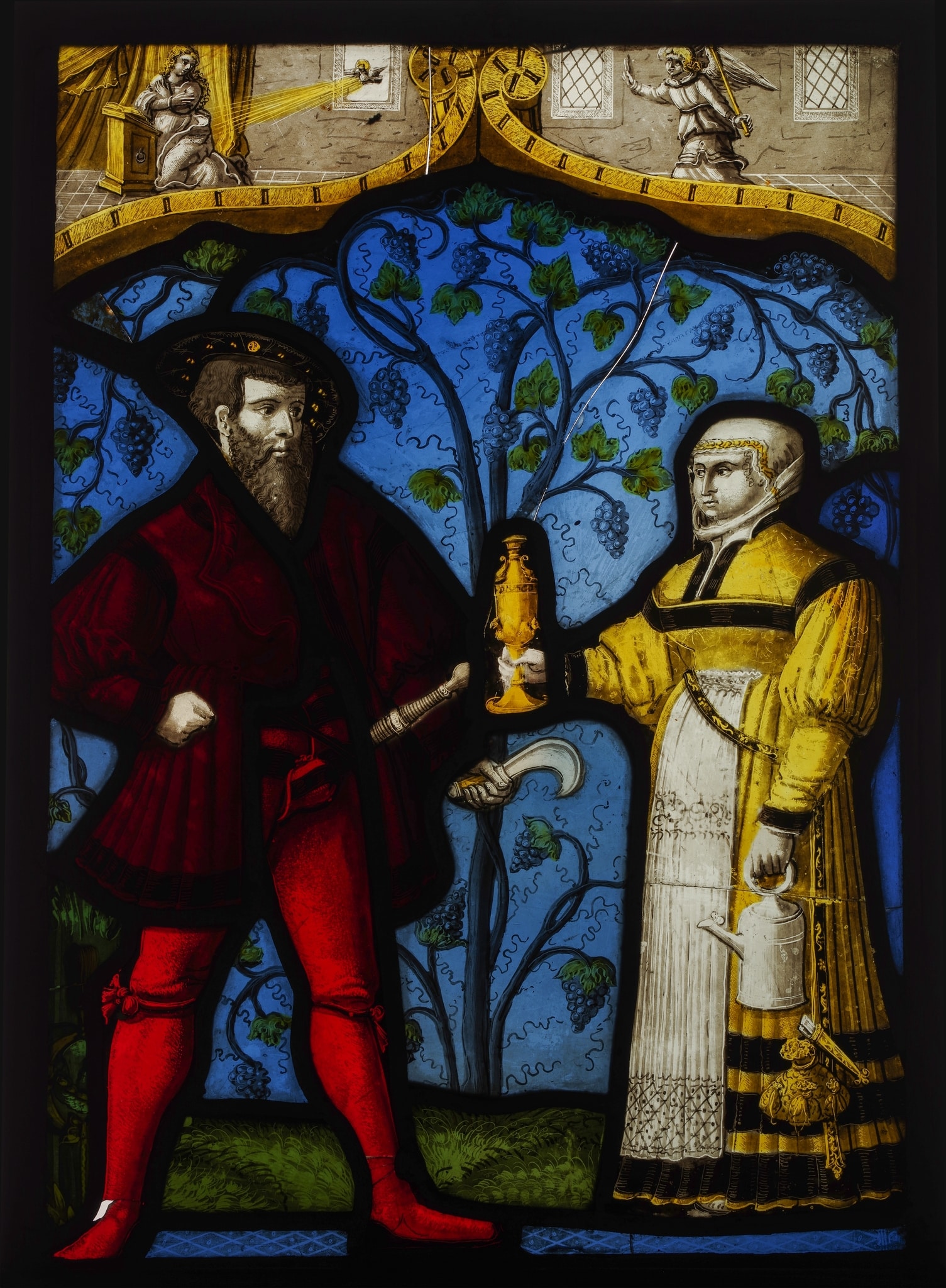En l’absence de la partie inférieure qui figurait probablement les armoiries des donateurs et une inscription, le couple de commanditaires n’a pas pu être identifié. Le cep de vigne, la serpe et la channe en étain indiquent cependant qu’il s’agit d’un couple de vignerons.