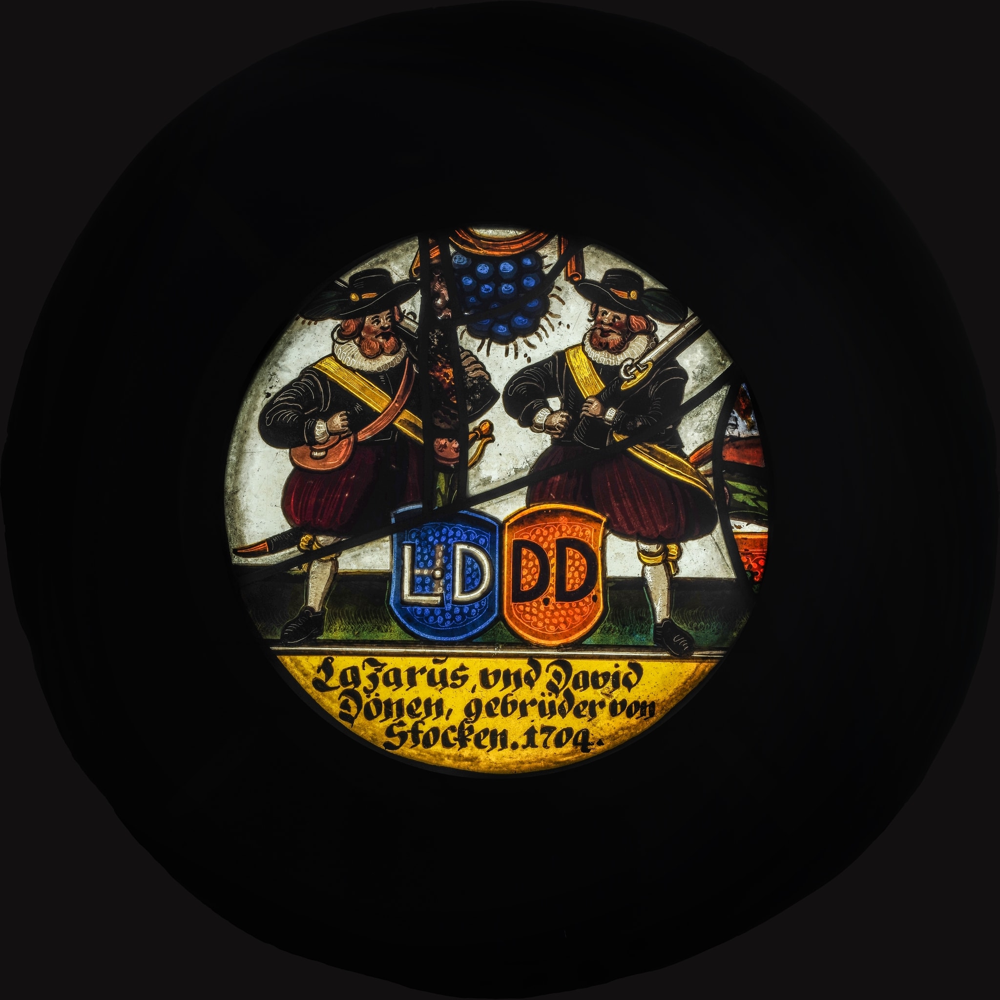 Le rondel a été offert en 1704 par les frères Lazare et David Thönen (Dönen), originaires de Stocken. Leurs écus monogrammés aux initiales de leurs noms respectifs ne correspondent pas à des armoiries connues. Les commanditaires, représentés avec une grappe de raisin, exerçaient peut-être l’activité de vignerons. Les anciens inventaires (Deonna, 1938, p. 179 ; Witzleben, 1977, p. 117) ont identifié la localité de Stocken comme étant l’ancienne commune bernoise du Stockental, dont le territoire était constitué de forêts et d’alpages. Il pourrait également s’agir de la petite juridiction de Stocken de l’ancien bailliage de Kyburg (ZH), particulièrement connue pour son vignoble (Bütikofer, 2002), correspondant à la profession supposée des commanditaires. A ce jour, nous ne possédons pas plus d’informations sur les donateurs.