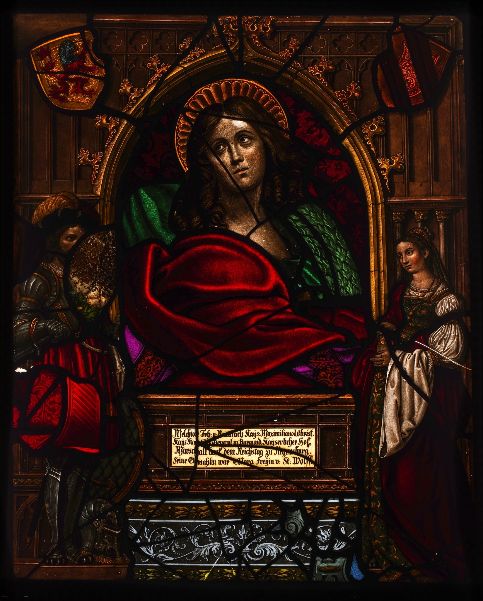 Sous un arc en accolade est représentée une sainte en buste, au torse de profil et à la tête de face disposée sur un socle sur le fronton duquel se présente un cartouche contenant une inscription. De part et d’autre de la sainte se tiennent en pied à gauche Melchior von Reinach et son épouse Claire Anne de Saint-Loup à droite. Lui est vêtu d’une demi-armure, un casque posé à ses pieds, et est coiffé d’un chapeau à plumes, alors que sa femme est habillée d’une blouse blanche à larges manches sur laquelle est disposée une robe à bretelles. Elle tient dans ses mains un petit gobelet (?) décoré d’une fleur. Dans les écoinçons au-dessus de l’arc en accolade le blason de la famille von Reinach à gauche et un blason aux armes de Claire Anne de Saint-Loup (?) à droite.