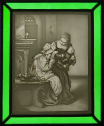 Le cinquième en bas à droite représente une scène d’intérieur réunissant deux femmes : l’une est assise à côté d’une cheminée et d’une grande coupe de fruits, les mains jointes, regardant avidement un coffret de bijoux que lui présente l'autre jeune femme debout, penchée vers elle.