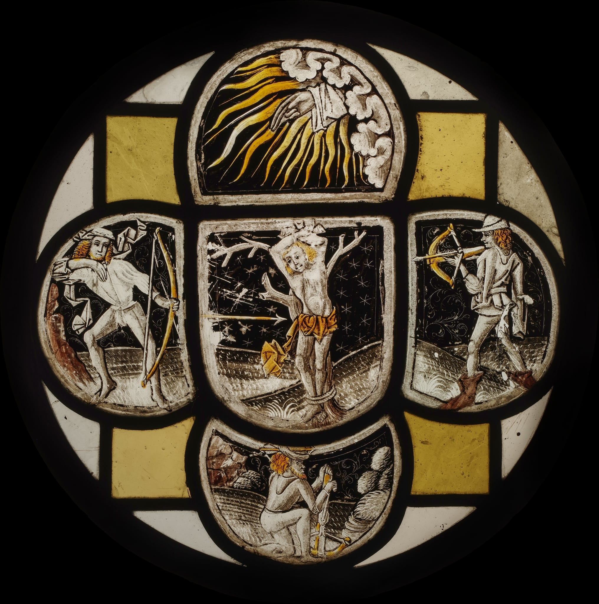 Ce vitrail quadrilobé représente le martyre de Sébastien, saint patron des tireurs. Il pourrait avoir été commandé par une “Confrérie de saint Sébastien”, société de tir à l’arc et à l’arbalète, comme il en existait de nombreuses au XVe siècle (Lapaire, 1980, p. 30). Il était peut-être destiné à orner les baies du siège de cette confrérie non identifiée.