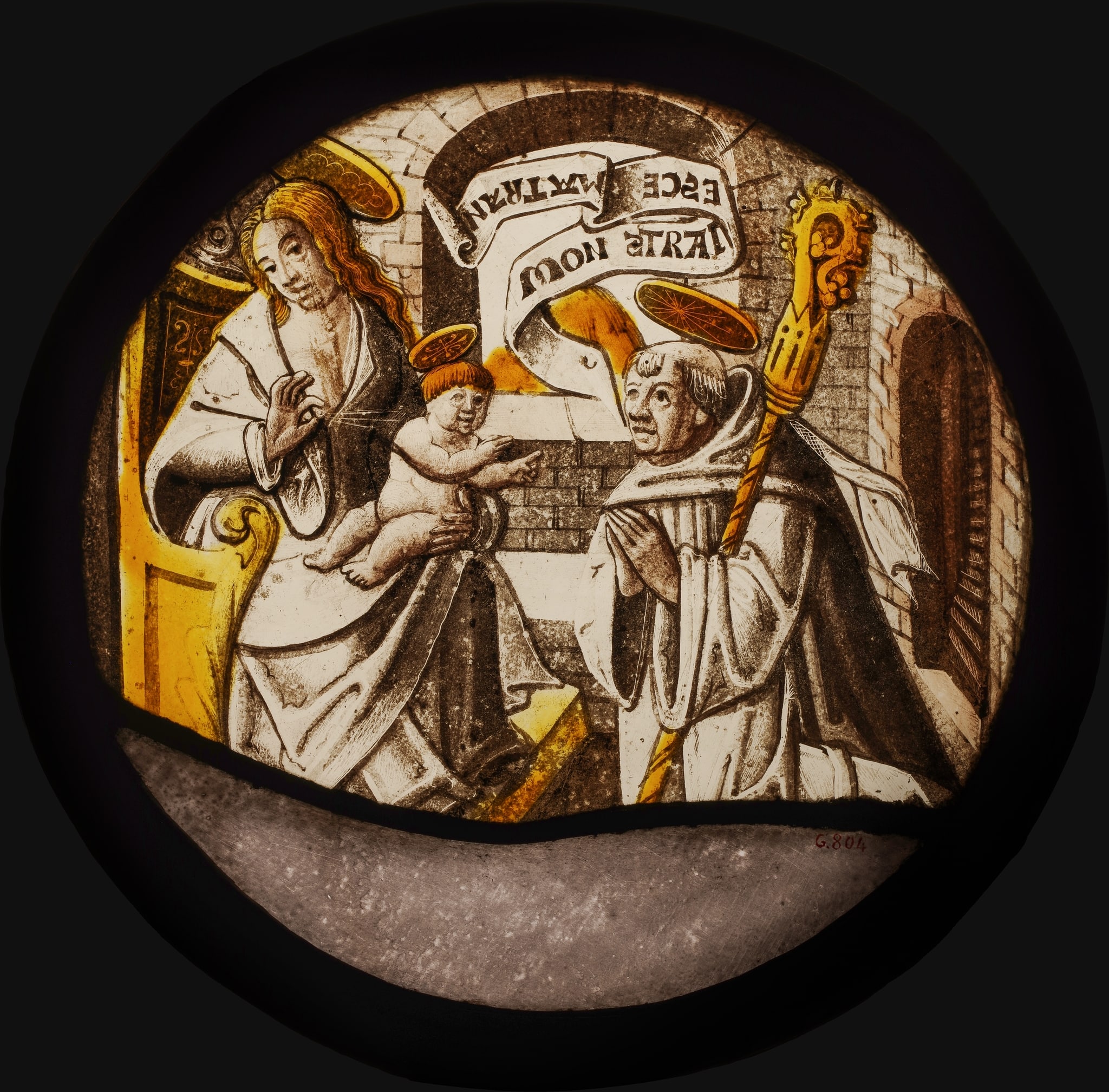 Vitrail amputé de sa partie inférieure, un plomb de casse, quelques rayures, revers partiellement abrasé, dont la grisaille.