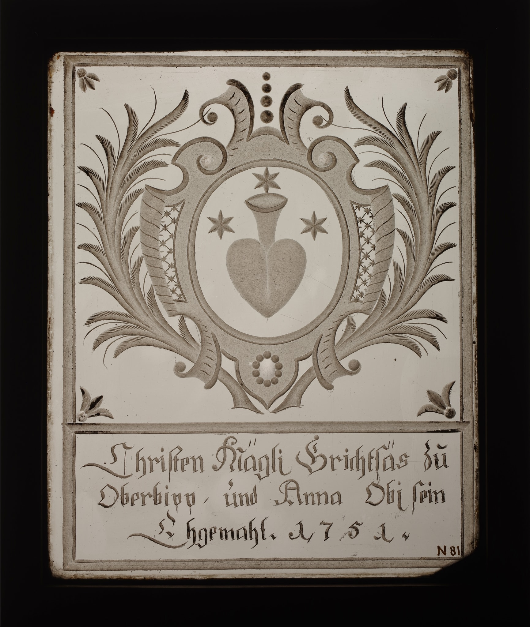 Dans le sillage de la prospérité économique que connaît la campagne bernoise et ses habitants au cours du XVIIIe siècle, cette nouvelle forme de vitrail venue de Bohème ou de Silésie se développe, attestant de la richesse de leur propriétaire (Paravicini-Stähelin, p. VIII). Ronds, ovales ou rectangulaires, ces panneaux gravés correspondent aux envies de lumière et de clarté dans les intérieurs du XVIIIe siècle. Ils sont élégamment et sobrement ornés d’inscriptions des donateurs, de citations bibliques, d’écus armoriés et d’ornements, parfois rehaussés à la grisaille (Rutsch, 1947, p. 5). Cet art populaire a décliné dès le XIXe siècle, dans un contexte de troubles politiques et d’essor croissant de l’industrie (Rutsch, 1947, p. 4).