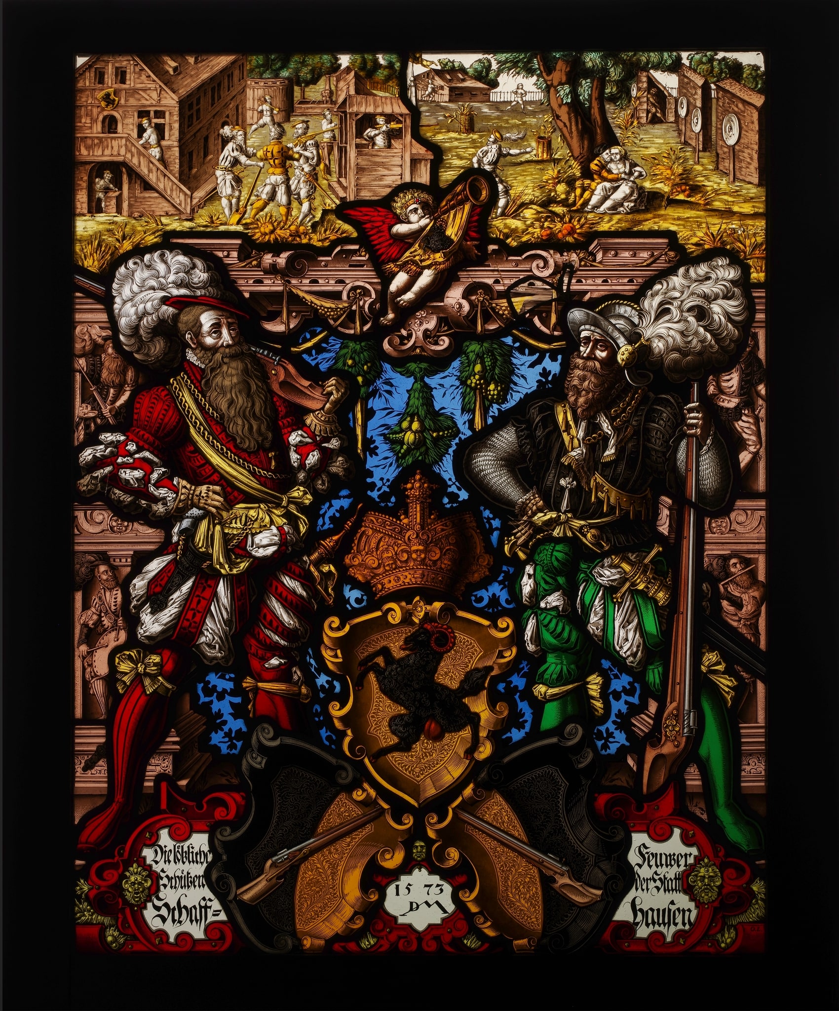 En bas au centre, de part et d’autre d’un cartouche couronné d’une tête d’homme barbu, figurent les armoiries de la corporation des tireurs de Schaffhouse et de la ville Schaffhouse, présentées en pyramide et surmontées d’une couronne. A gauche en pied, se tient un mousquetaire, son arme posée sur son épaule alors qu’à droite un second soldat tient son mousquet devant lui, la crosse posée au sol. Le premier, coiffé d’un petit chapeau à plumes est vêtu de rouge et de blanc, le second portant une cote de maille, a sa tête couverte d’un casque à plumes. Ces deux membres de la corporation portent à leur ceinture une épée. L’encadrement architectural est composé de piliers sculptés ornés de différentes figures en haut-relief (musiciens et soldats), des guirlandes de feuilles et de fruits tombant au centre de l’entablement, au-dessous d’un ange musicien. Au-dessus, une scène illustre des mousquetaires s’entraînant à tirer sur des cibles disposées contre des murs de briques, alors que d’autres vaquent à diverses occupations.